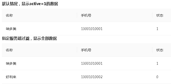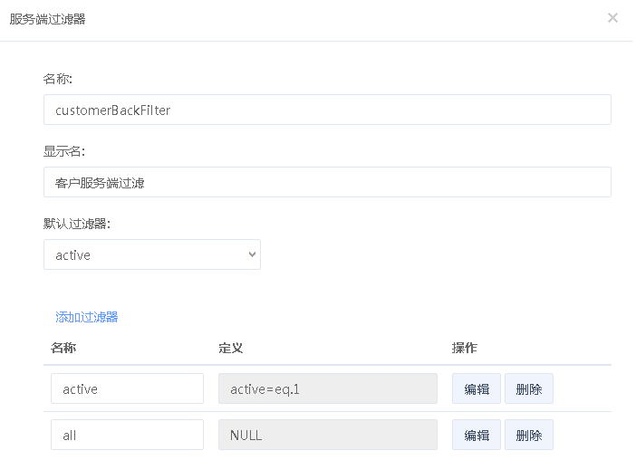 在这个服务端过滤中,添加两个过滤器,一个是查询状态 active 等于1的过滤器,名为 active,另一个是查询全部数据的过滤器,名为 all。并设置查询状态 active 等于1的过滤器为默认过滤器。即在没有指明 customerBackFilter 的值时,对于客户数据集的查询,都会在已有的过滤条件后,施加 active=1 这个条件。指明 customerBackFilter=all 时,则不额外施加过滤条件,表示查询全部数据。