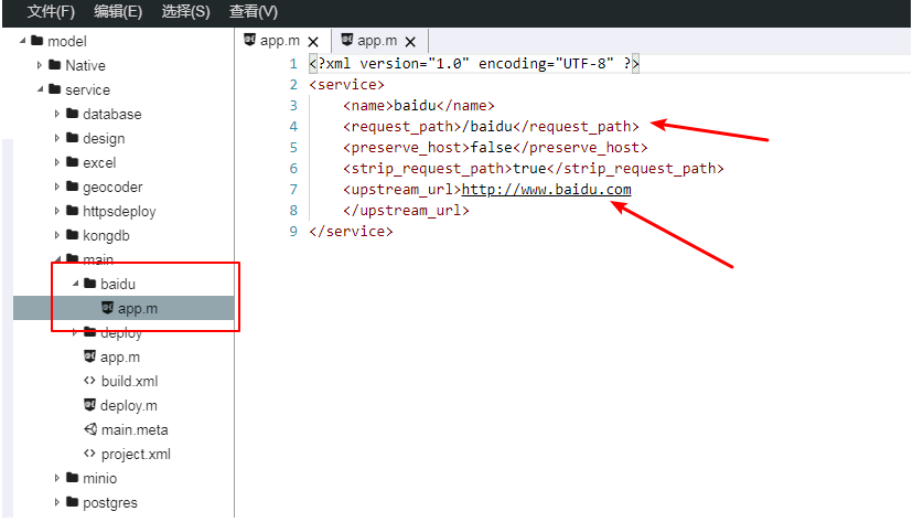 模块的 app.m 文件实现了网关注册,app.m 文件内容如下,在网关上注册对于request_path的请求,转调到upstream_url上。