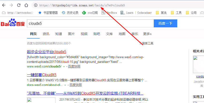 通过配置app.m,实现了在前端请求 http://域名/baidu,就会转调到 http://www.baidu.com 地址,运行效果如下图所示。