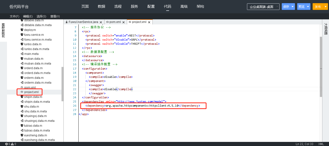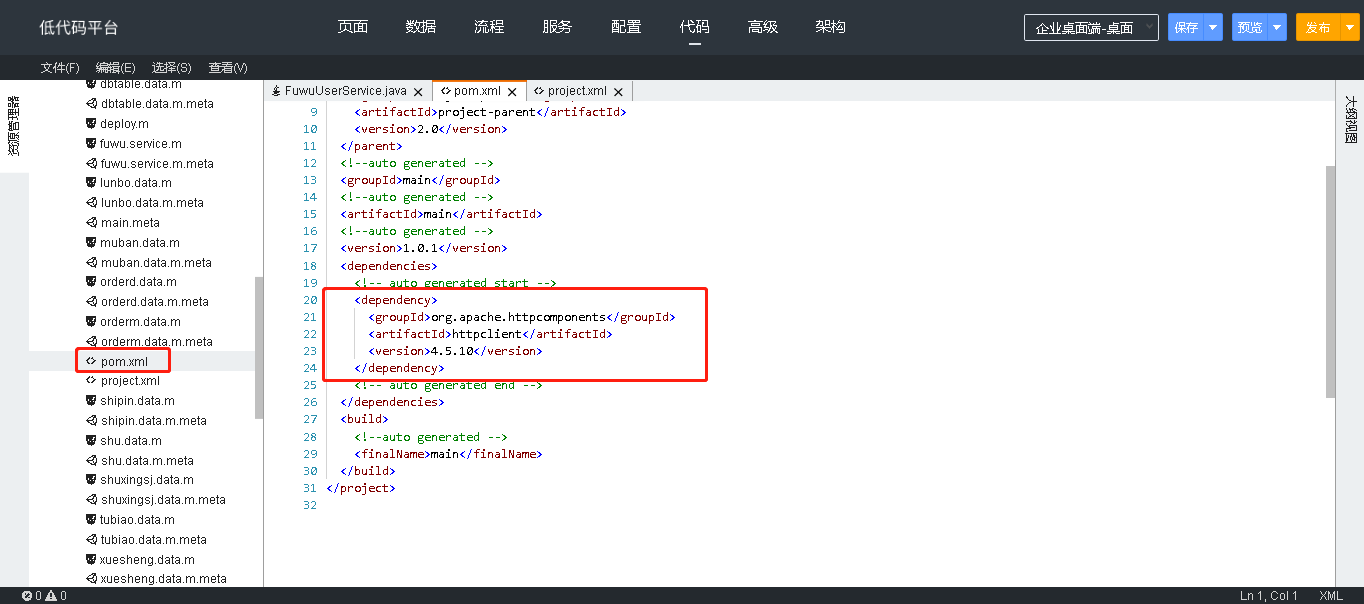 在服务的设置依赖中添加 httpclient 的配置信息,会在 project.xml 文件中增加一个 dependency 节点,如下图所示。