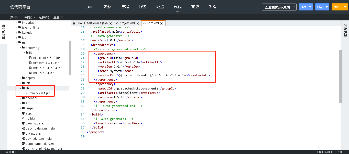 在服务的设置依赖中,上传 jar 文件。例如上传 minio-2.0.4.jar,会上传到 lib 目录下,依赖编译后,pom.xml 文件中增加了一个 dependency 节点,如下图所示。在java中可以 import minio 类了。