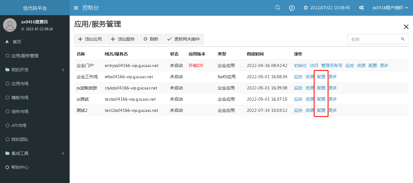在应用/服务管理中,配置每个应用的环境变量,如下图所示。