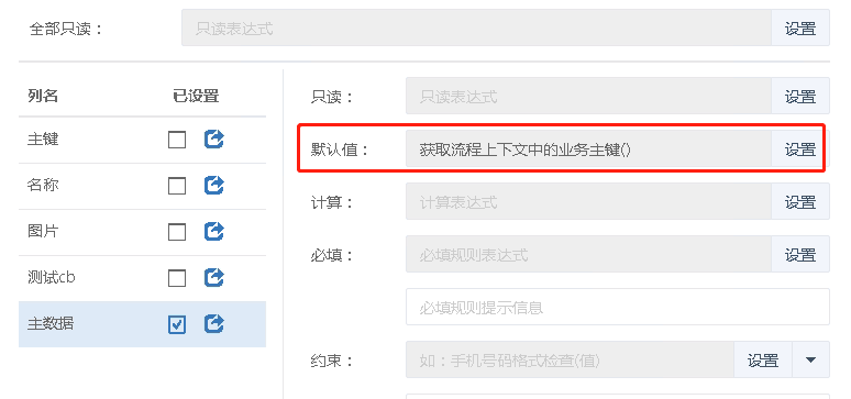 子流程的页面中设置流程组件关联的数据集中存储主表字段值的字段默认值为上下文组件中的:获取流程上下文中的业务主键()