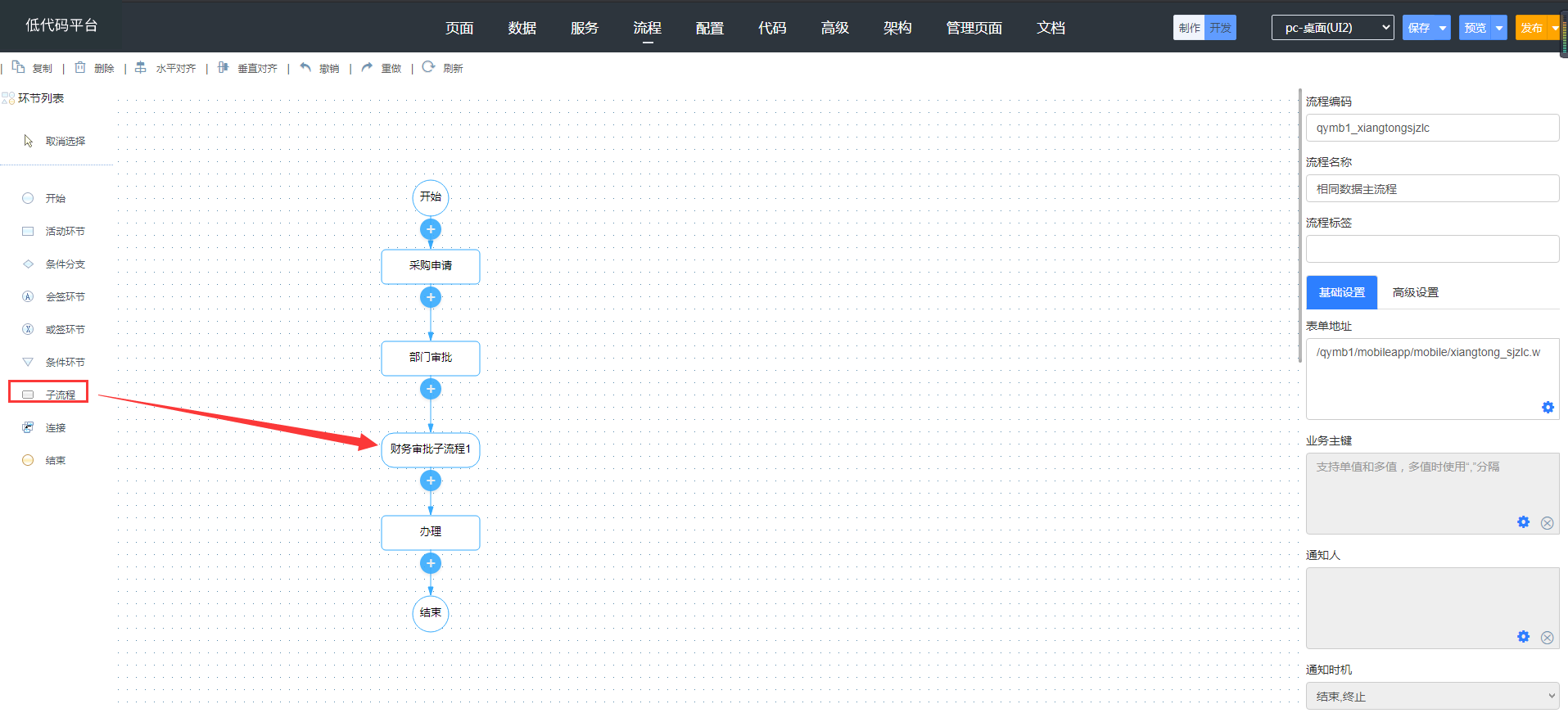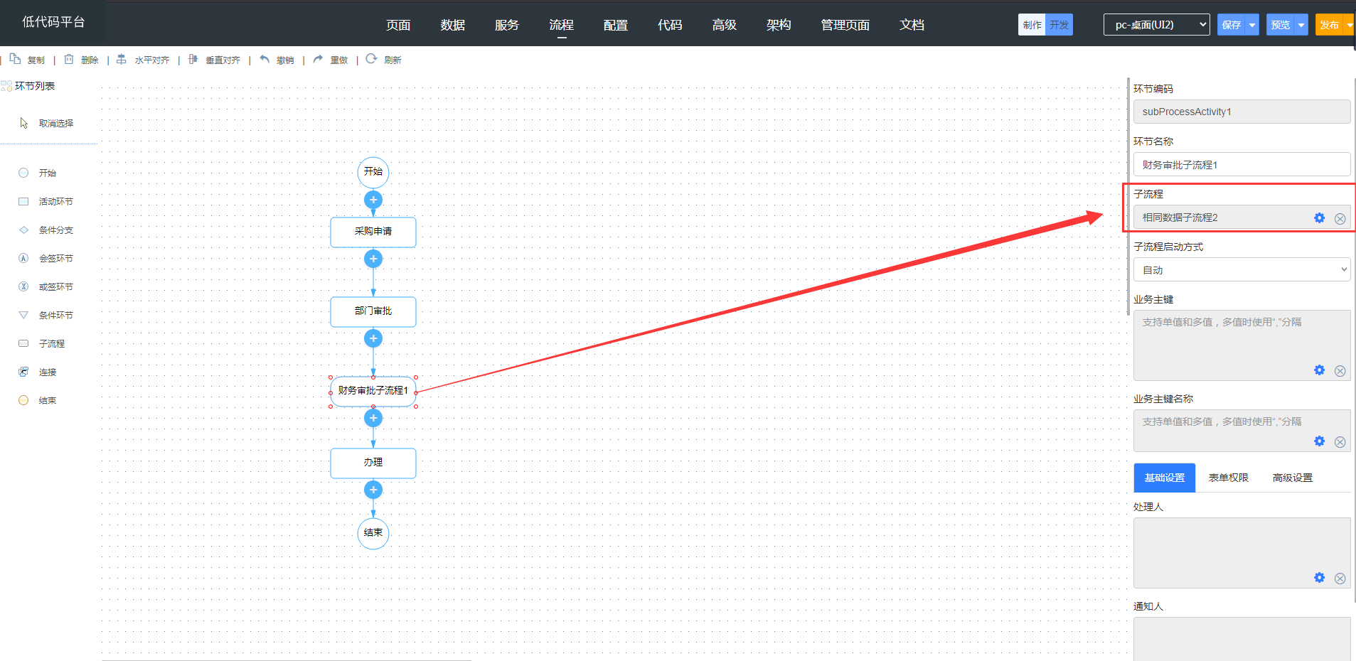 主流程和子流程使用同一个业务数据:如主流程采购申请,其中财务审批需要经过若干个环节,抽取成一个财务审批子流程;