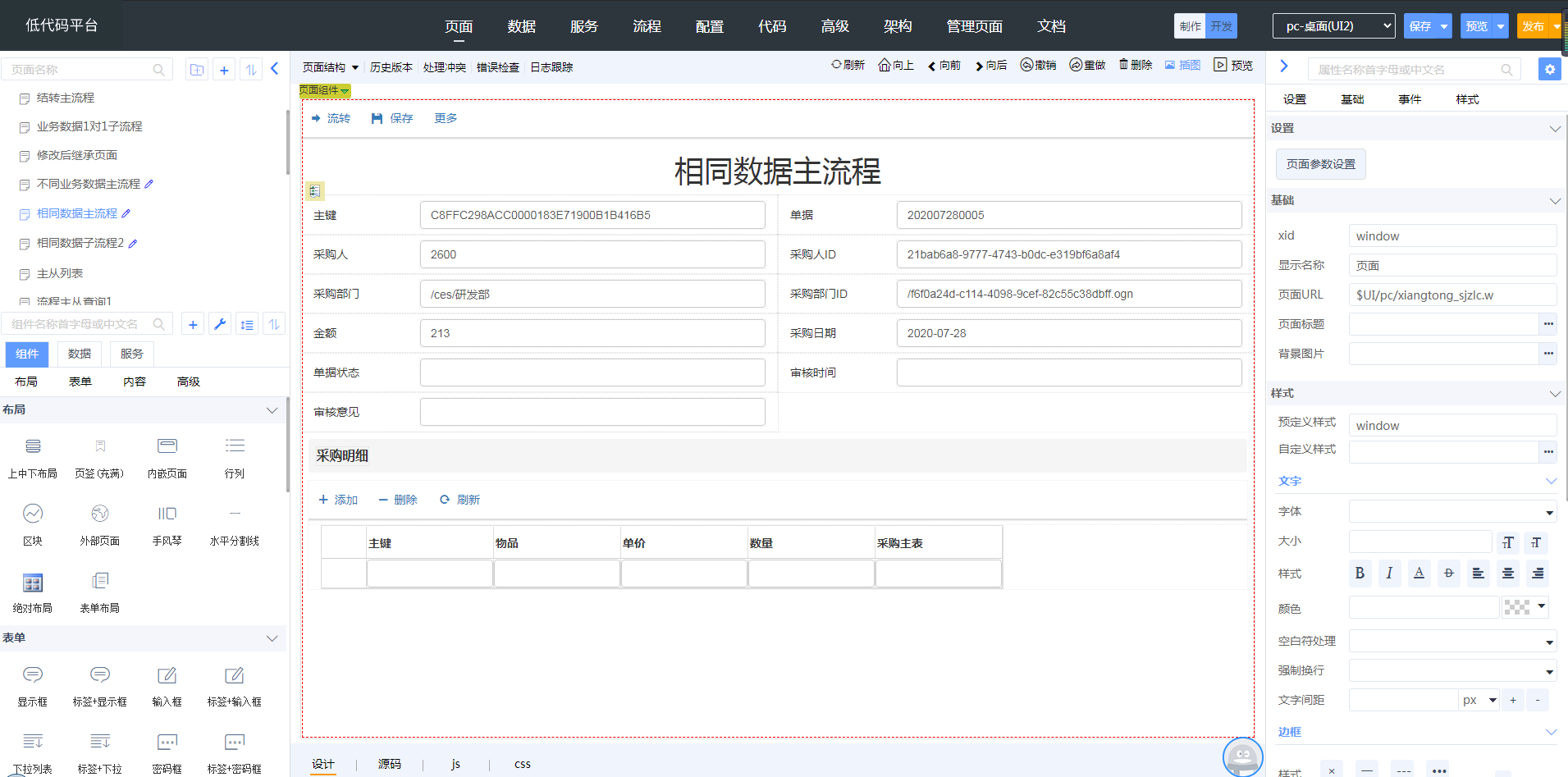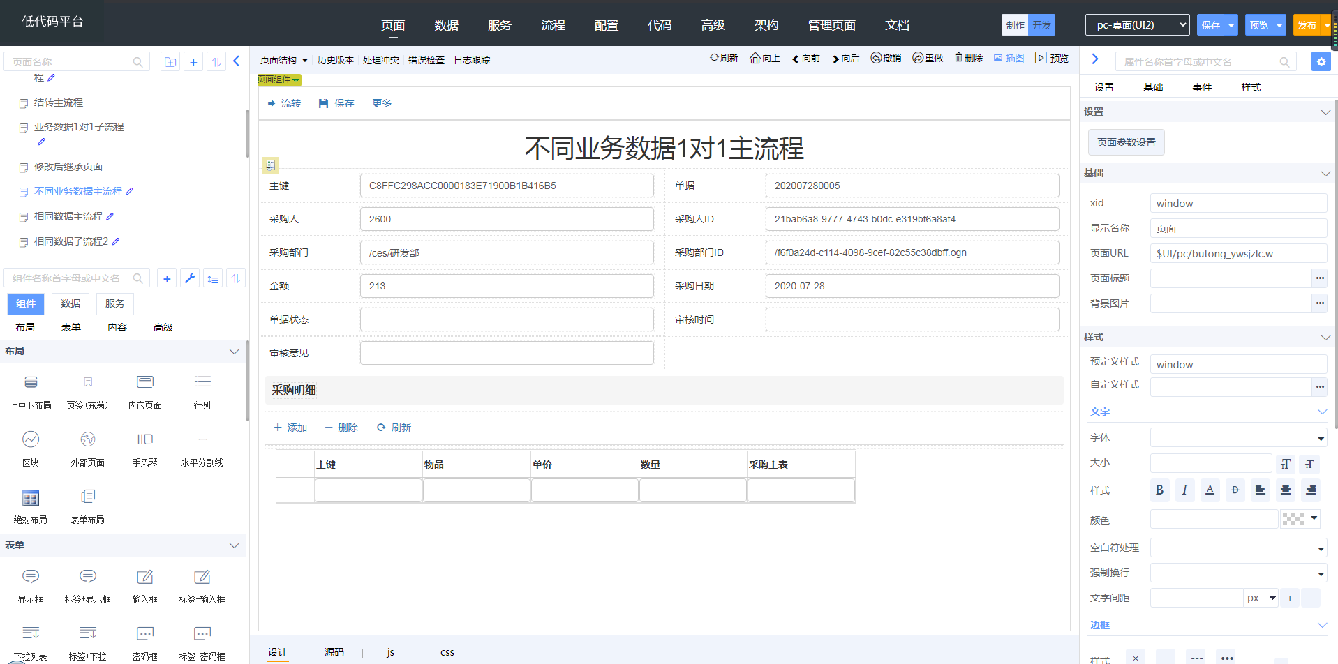 1. 首先创建两个使用同一业务数据的采购申请业务流程;主流程表单及流程如图
