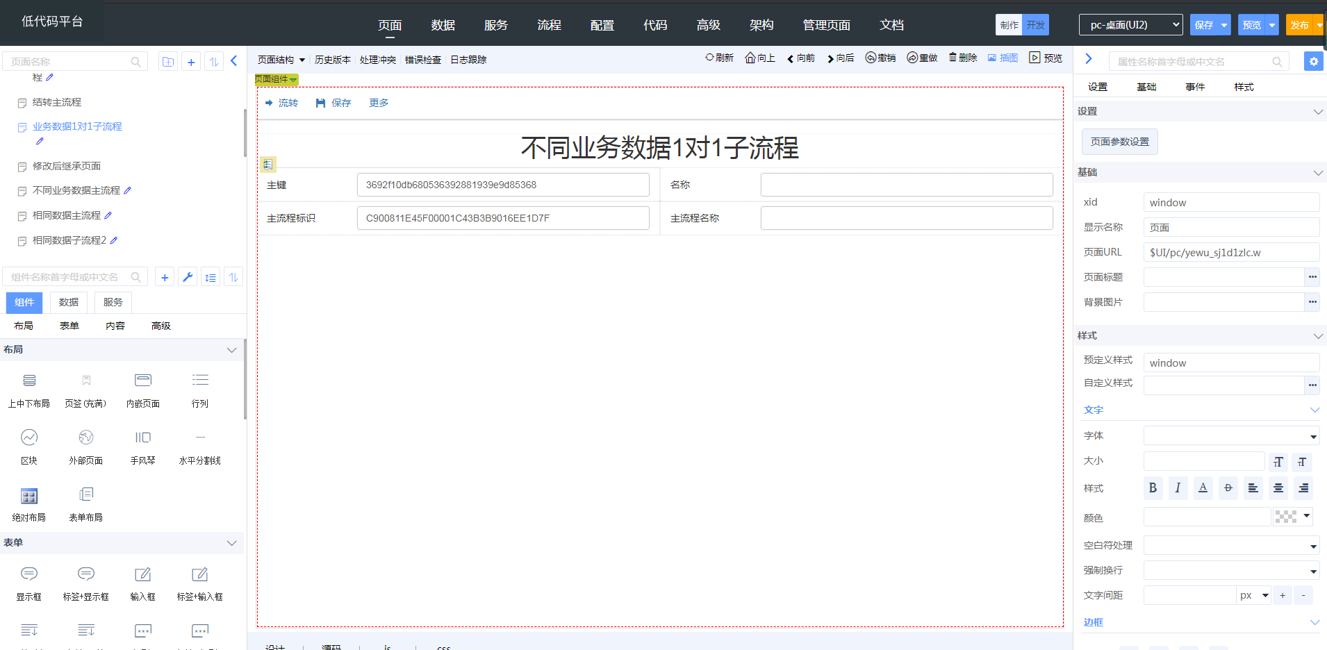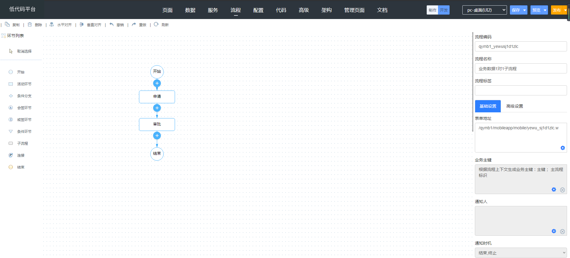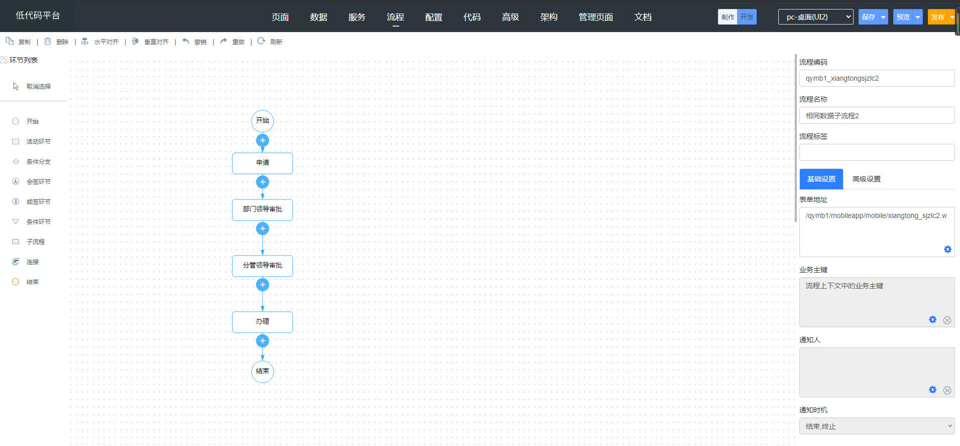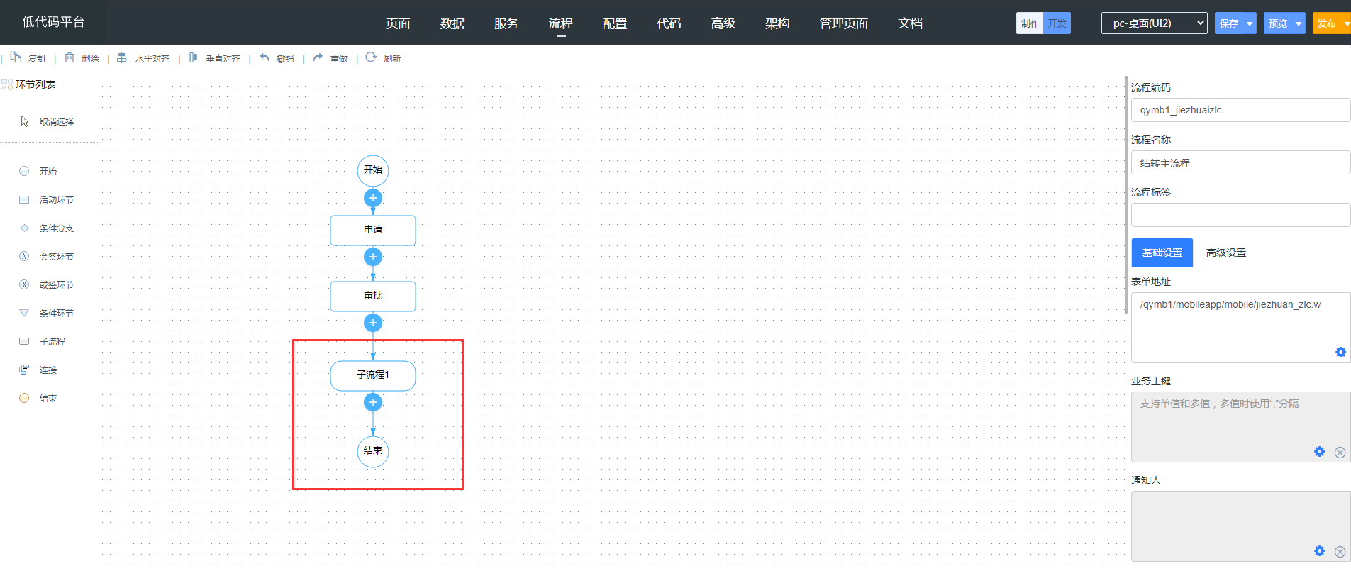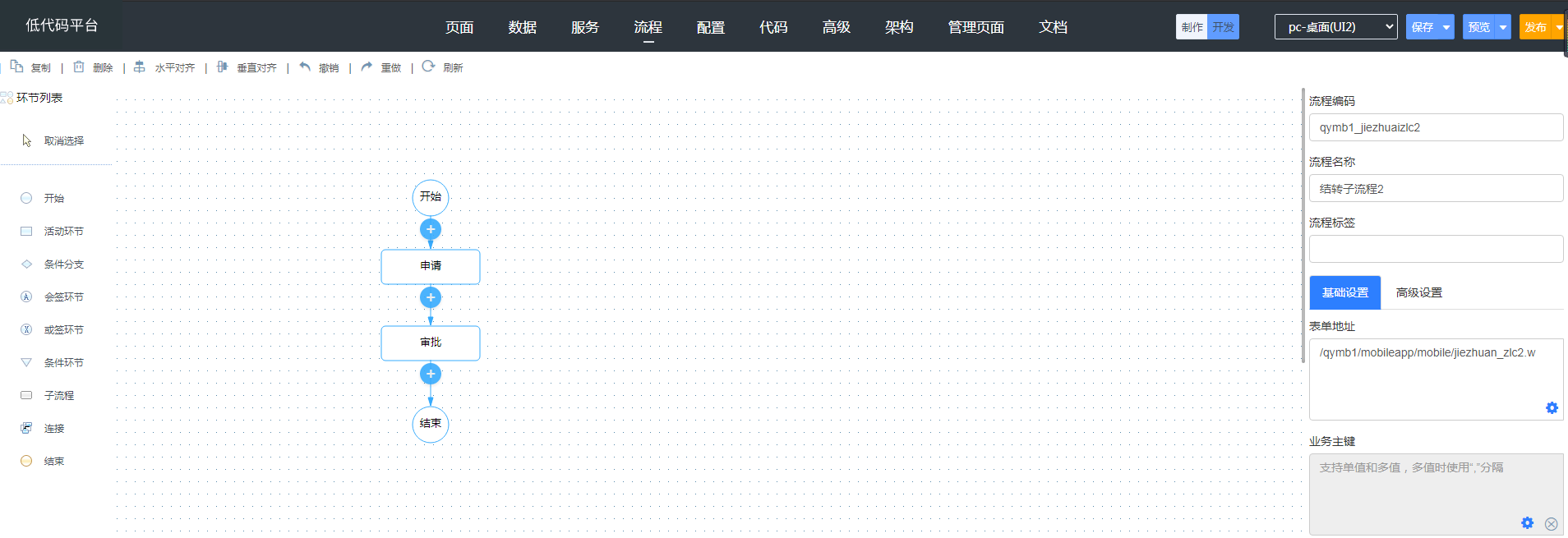 1. 首先创建两个使用不同业务数据的业务流程;子流程的业务数据添加存储主数据的业务主键字段;主流程表单及流程如图子流程表单及流程图如下: