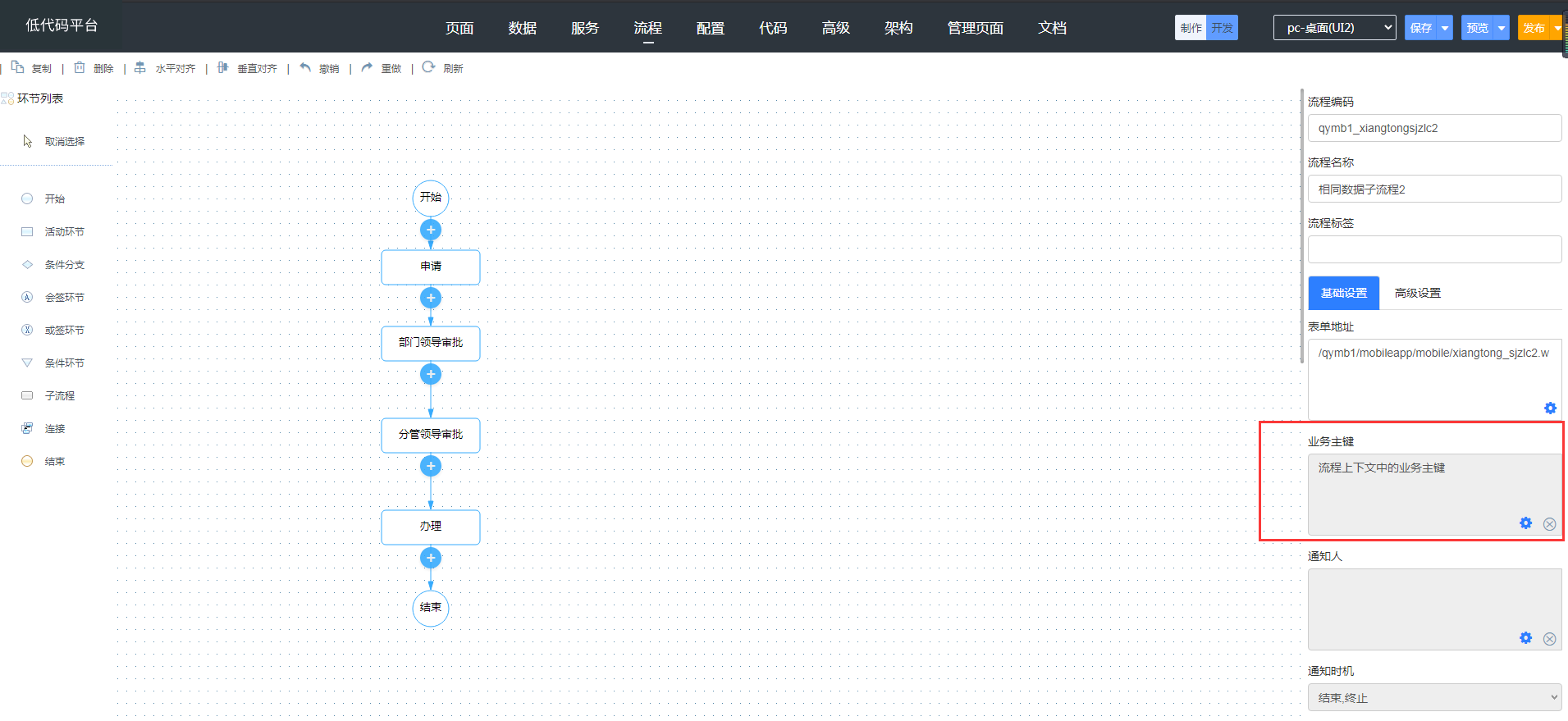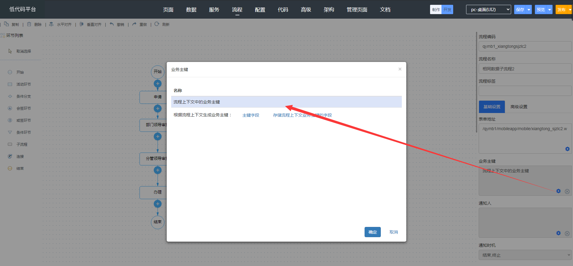 1. 打开子流程流程定义页面,设置业务主键属性;