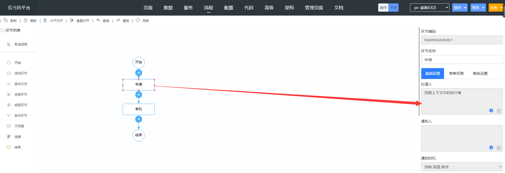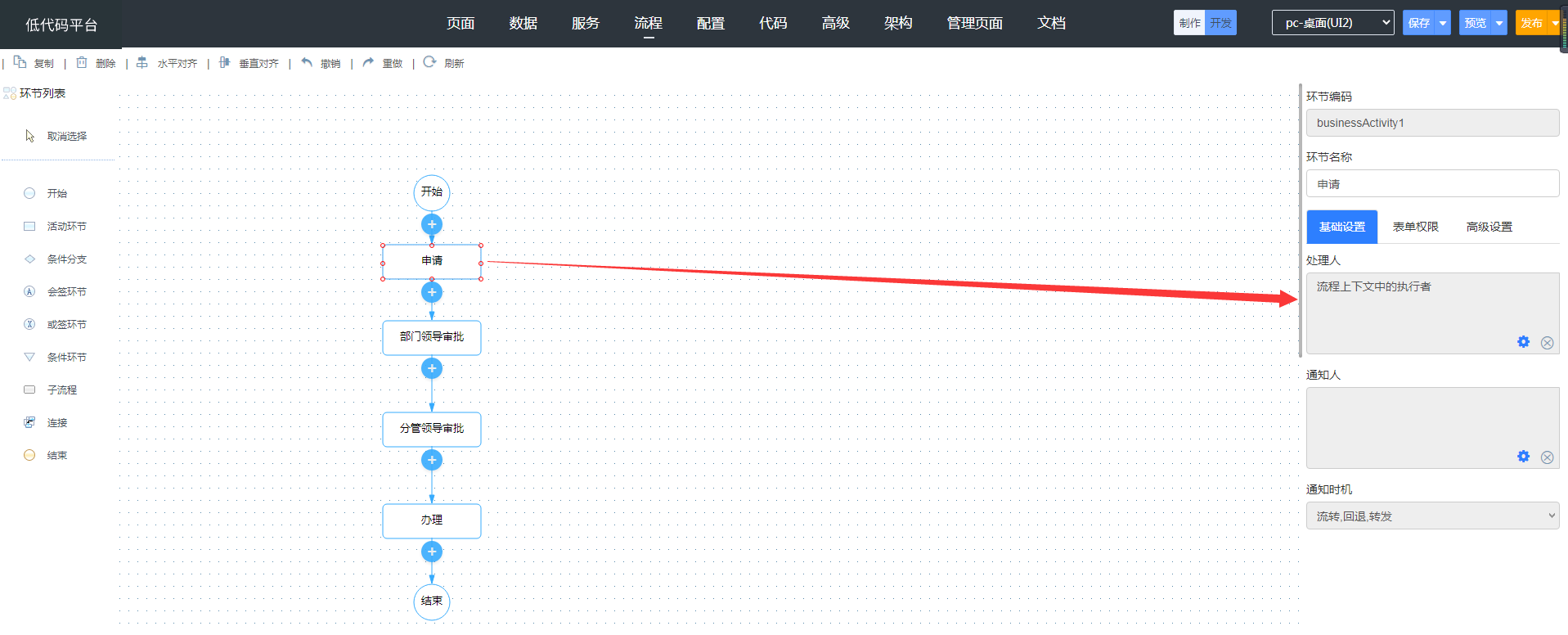 4. 选中流程首环节,并在首环节的处理人属性设置执行者:“流程上下文中的执行者”
