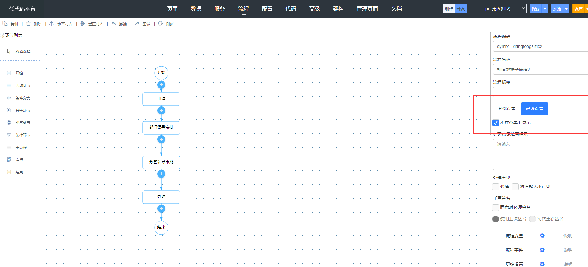 3. 如不允许子流程功能菜单在门户显示,则打开【高级设置】,勾选不在菜单上显示