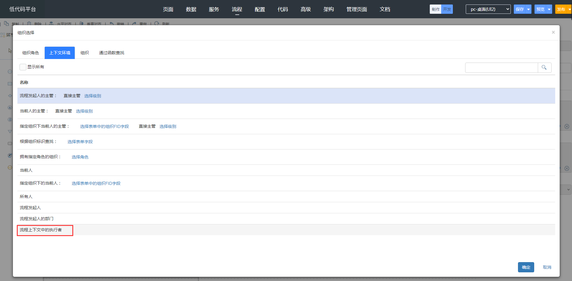 5. 点击⚙打开组织选择页面,在上下文环境中选中“流程上下文中的执行者”确定。