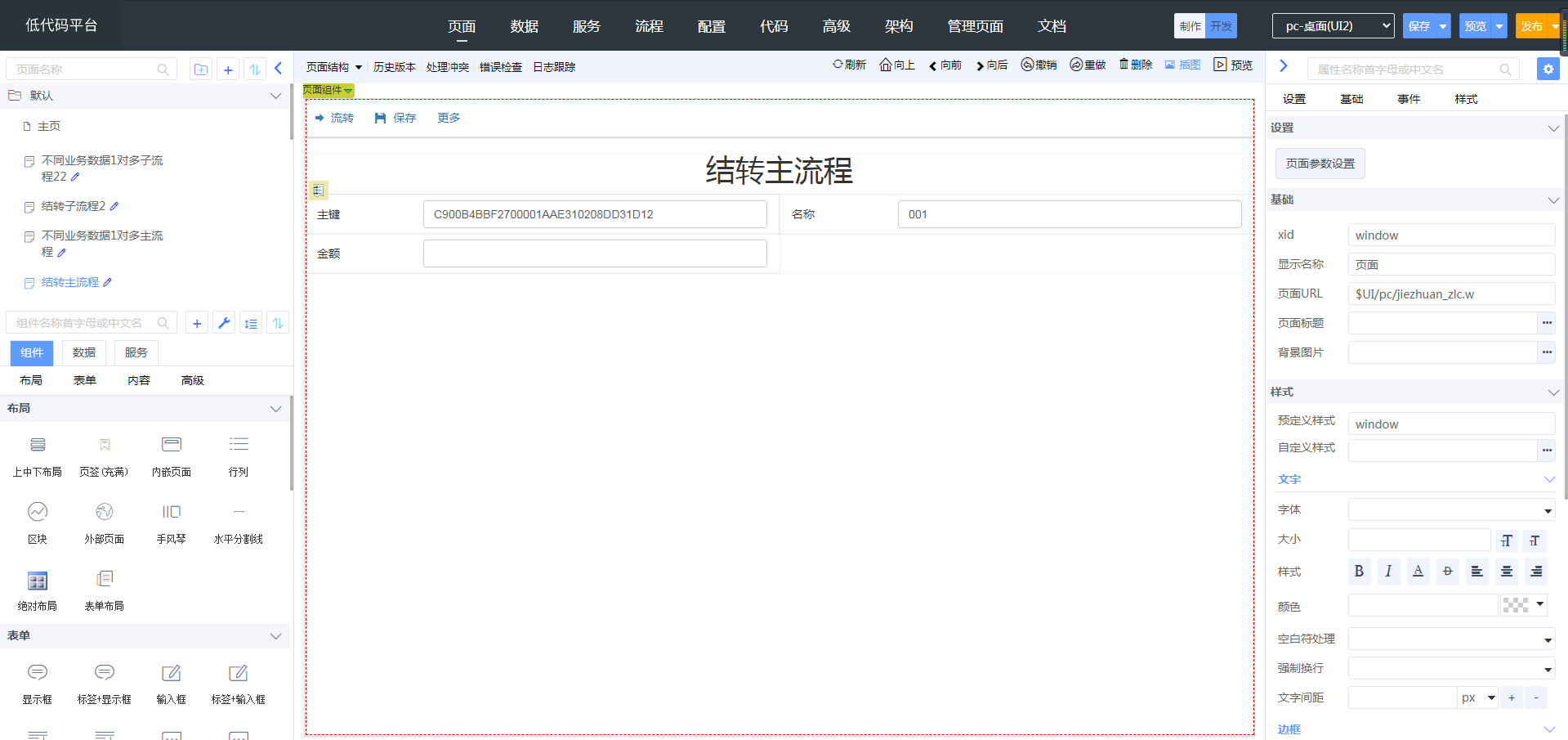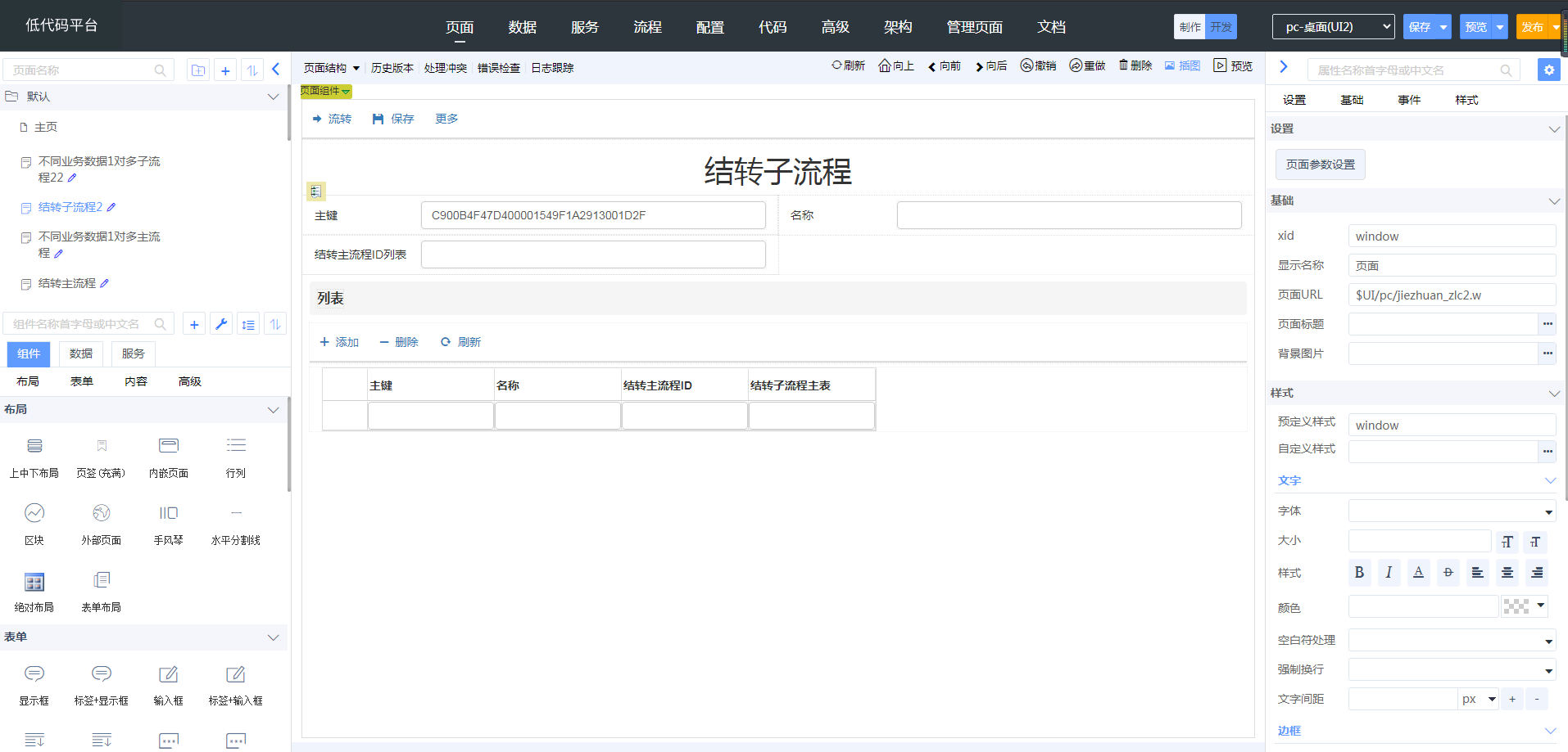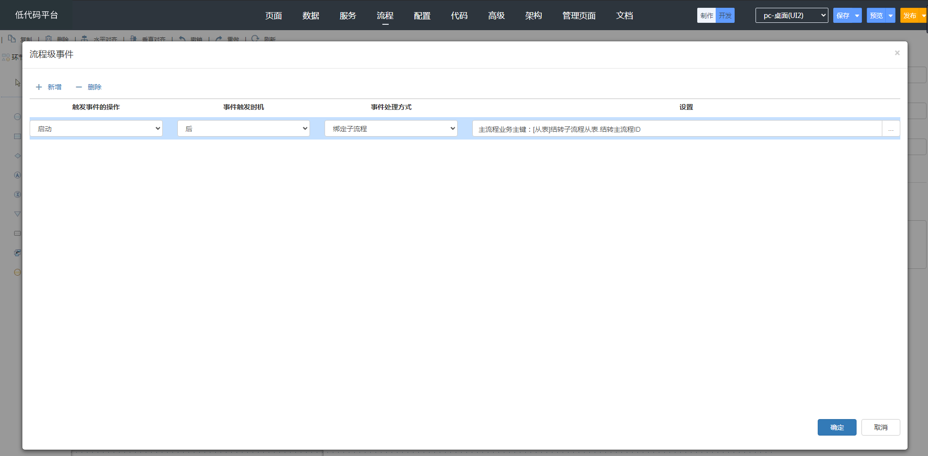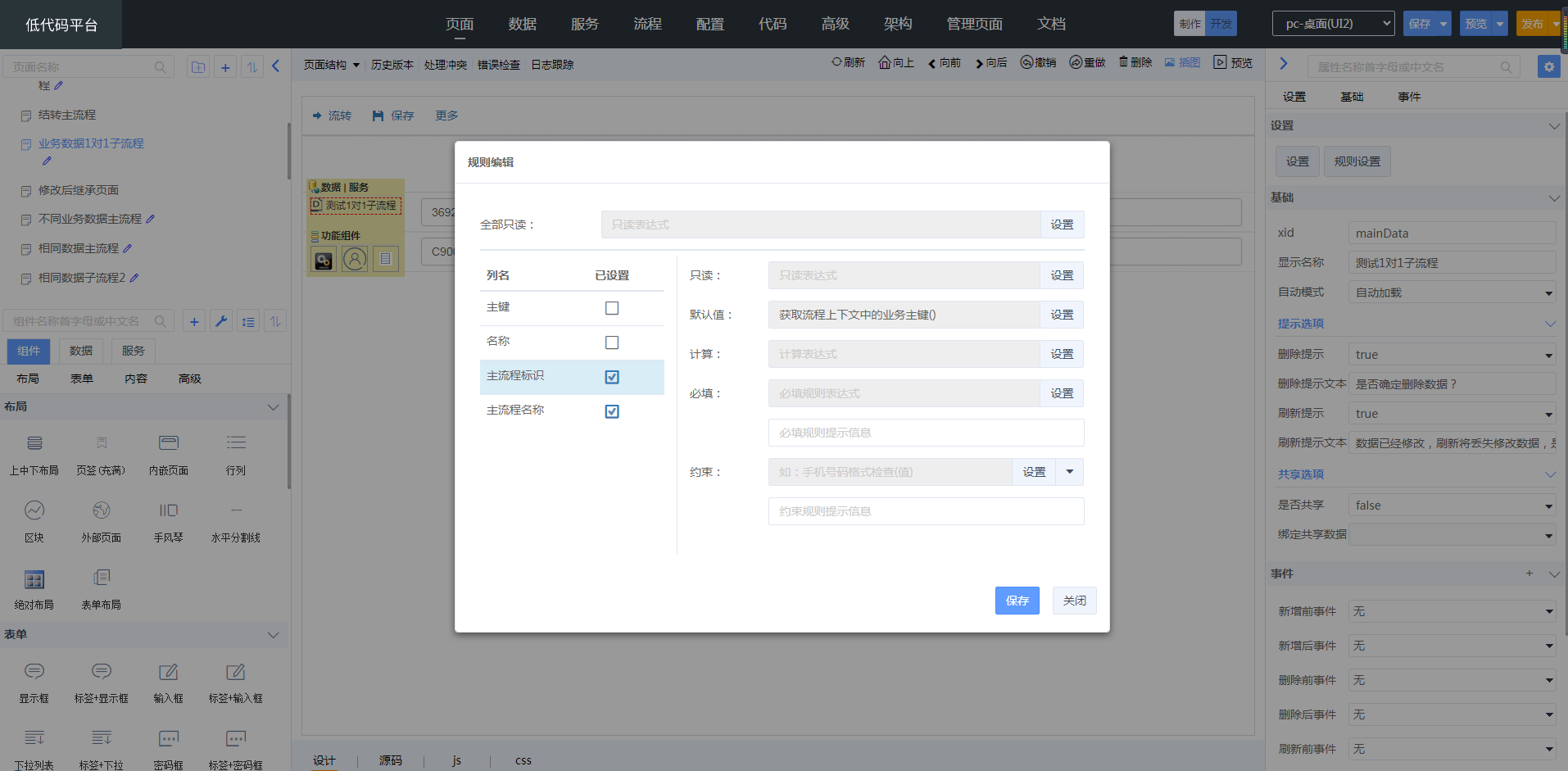 6. 打开子流程的页面,将主数据上用来存储流程上下文业务主键的字段的默认值为:流程组件的"获取流程上下文中的业务主键";子流程启动后,自动获取主流程的业务主键