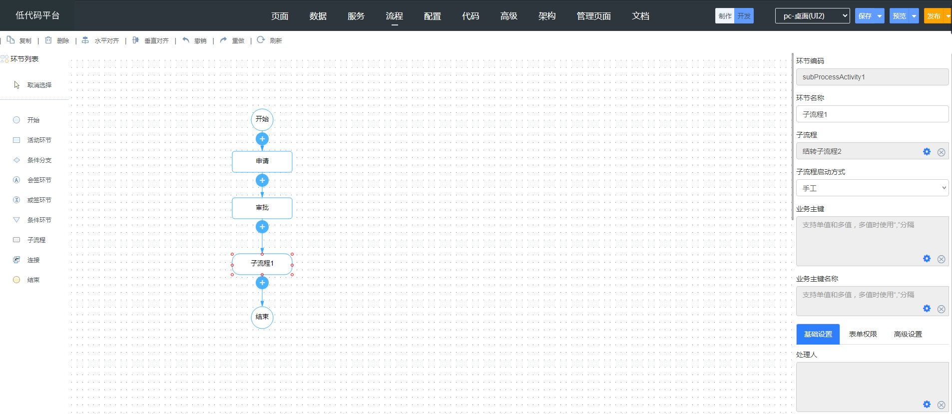 4. 子流程启动方式属性设置为自动,当流程进入到子流程环节会自动启动子流程。