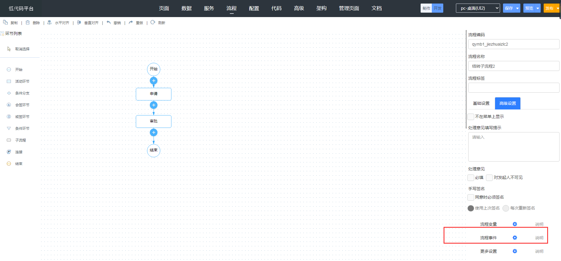 1. 打开子流程流程定义页面,切换到【高级设置】设置,点击流程事件属性设置流程启动后事件;