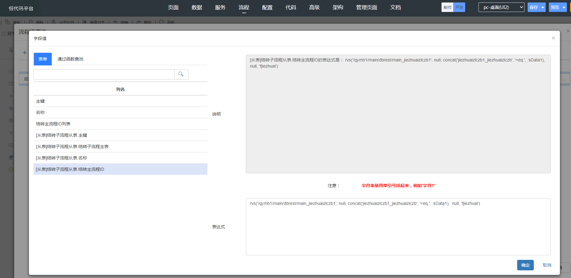3. 参数为"主流程业务主键",例子中为:[从表]结转子流程从表.结转主流程ID