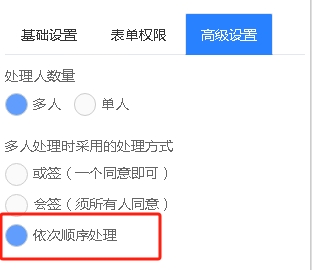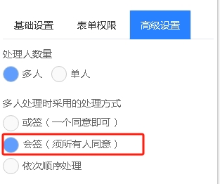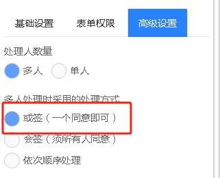流程定义中在环节的高级设置中提供了“多人处理时采用的处理方式”的设置也是设置执行规则中的选项,选择,如下: