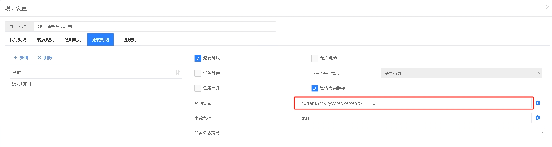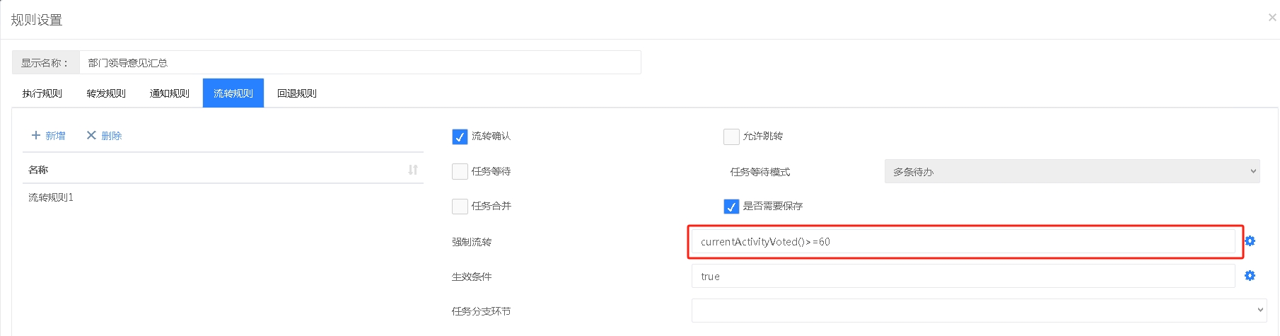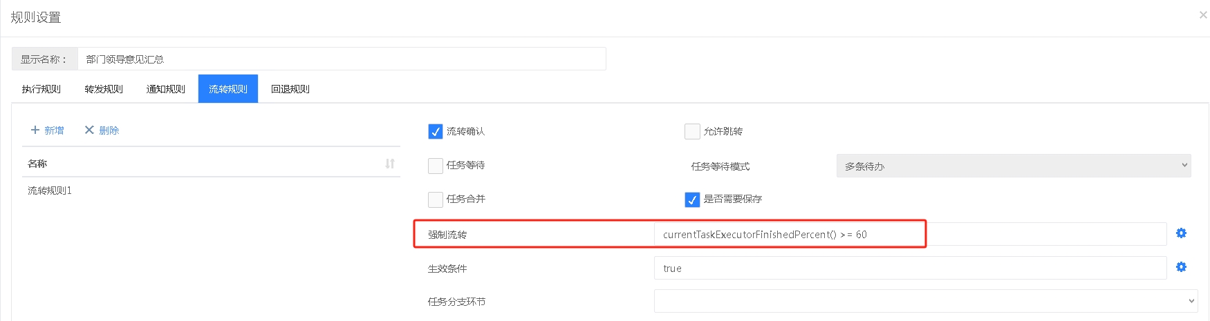此场景需要执行规则和流转规则结合设置,执行规则的设置同场景三一样,然后在流转规则中设置强制执行的表达式,提供的有“当前环节处理人完成百分比大于N、当前环节处理人完成百分比大于等于N”表达式可以直接使用,如上设置当“当前环节处理人完成百分比大于等于”大于等于60时就强制流转