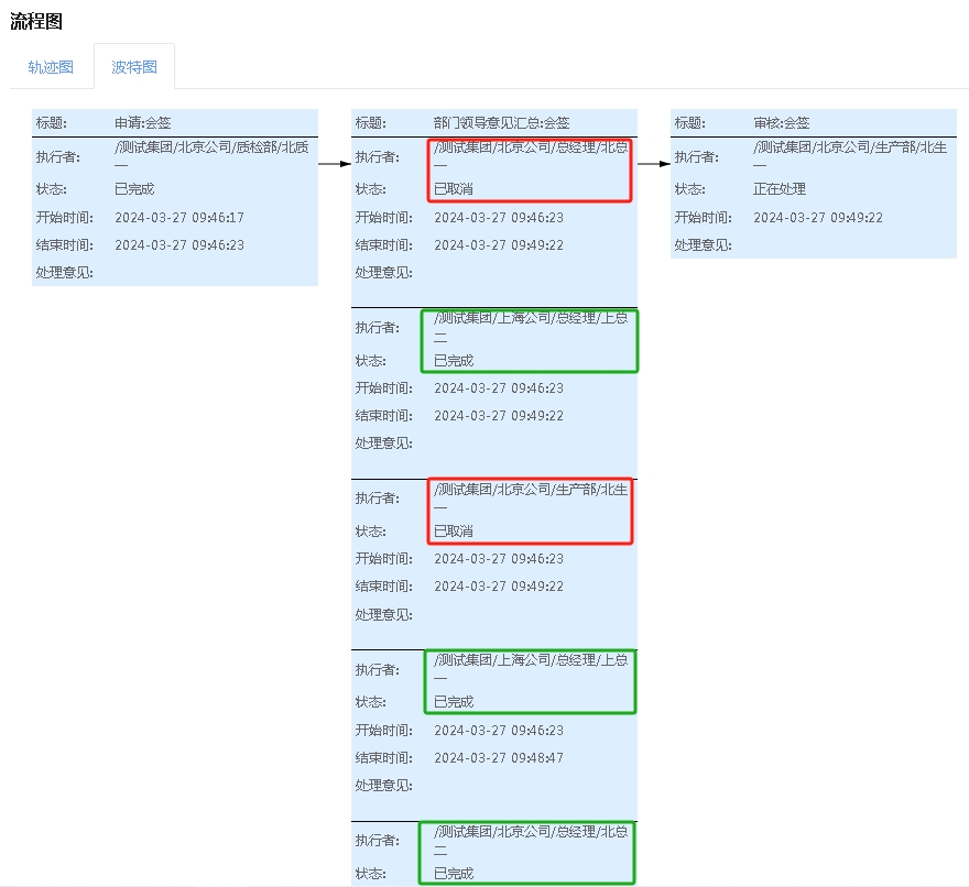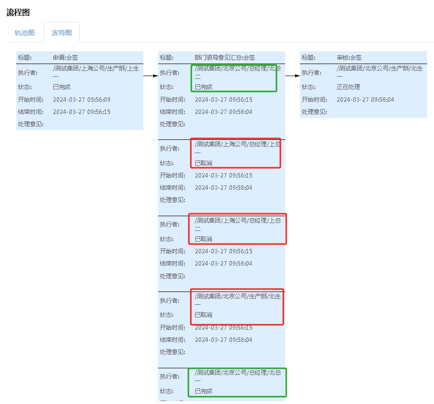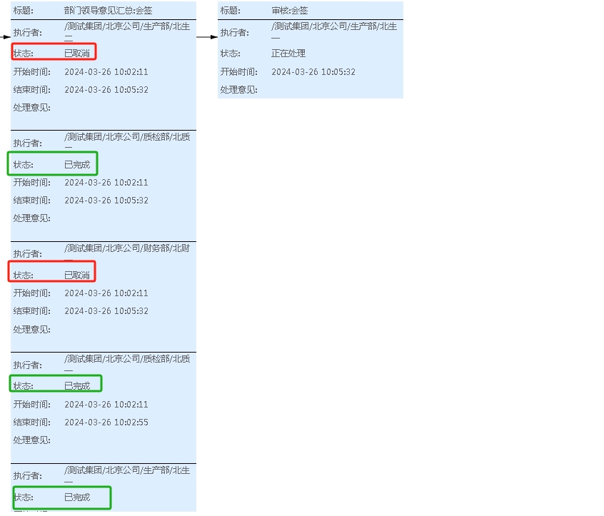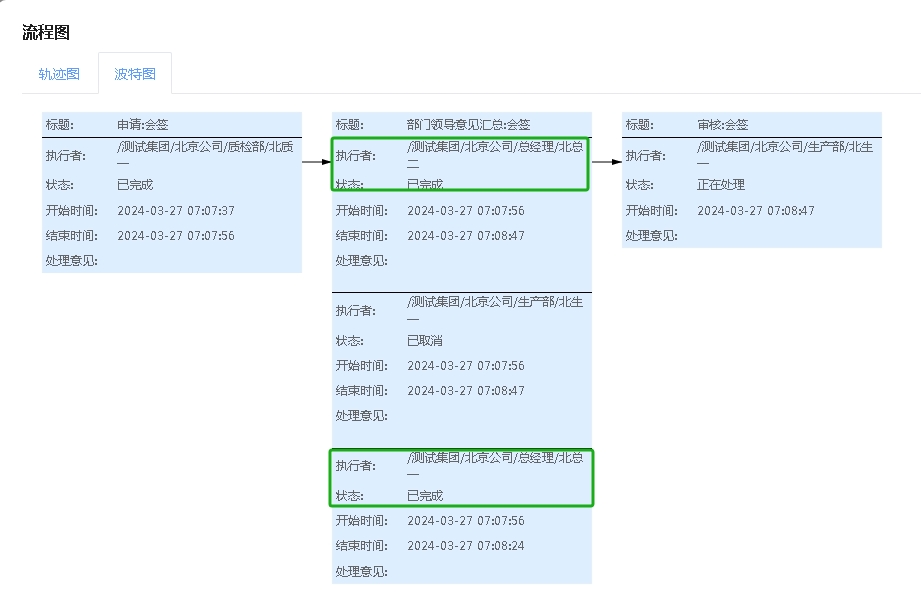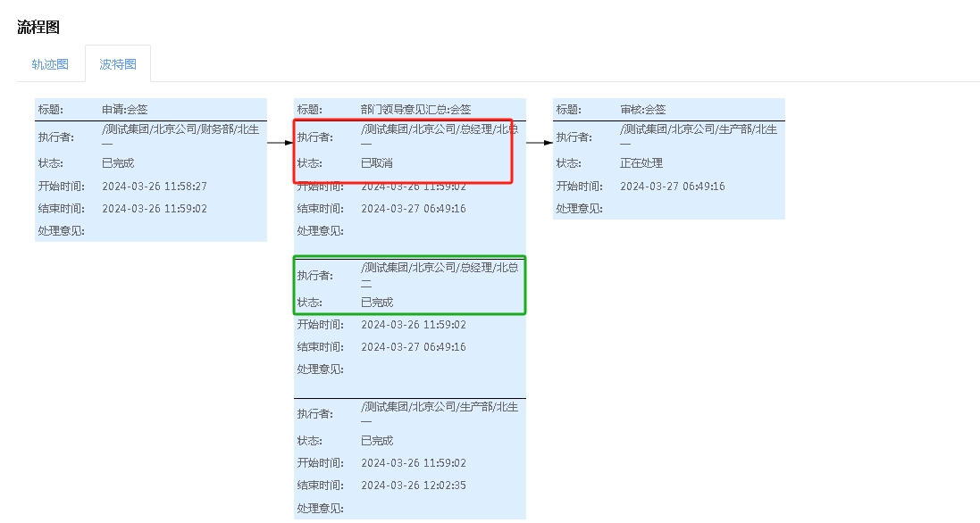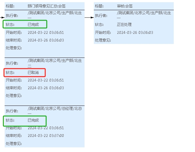 即当北总一和北总二都处理完成此环节就向下流转了;如果北生一没有处理,那么北生一的任务会取消不用再处理