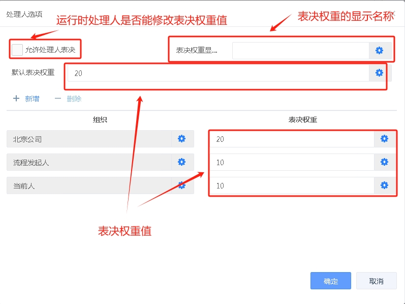 第一层:流程定义时,在指定环节执行者时,可以指定相应的表决权重值;可以定义运行时处理人是否能修改表决权重值(控制第三层是否可以修改),并指定表决权重的显示名称;
