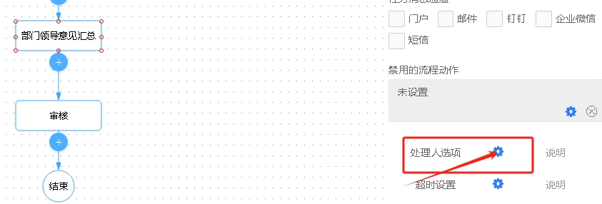 具体如下:环节的“处理人选项”中设置
