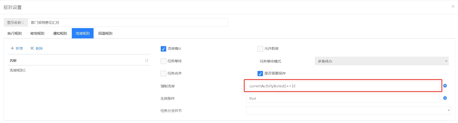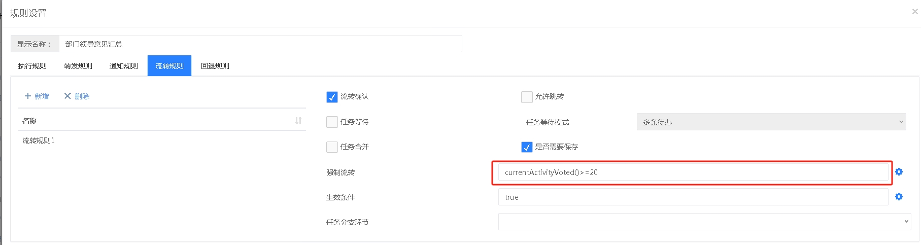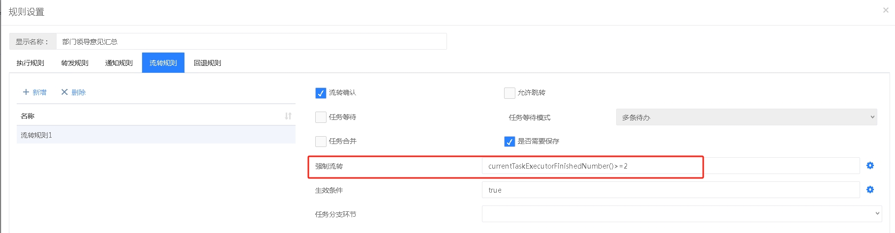 此场景需要执行规则和流转规则结合设置,执行规则的设置同场景三一样,然后在流转规则中设置强制执行的表达式,提供的有“当前环节处理人完成数”表达式可以直接使用,如下设置当“当前环节处理人完成数”大于等于2时就强制流转