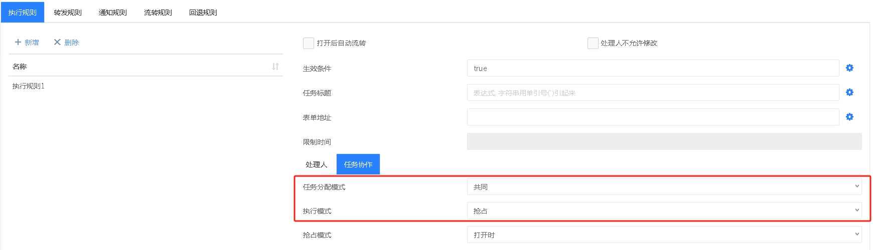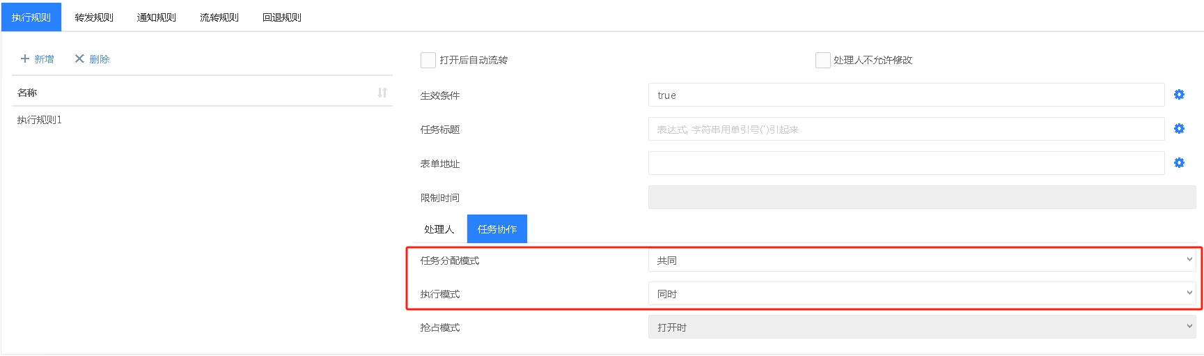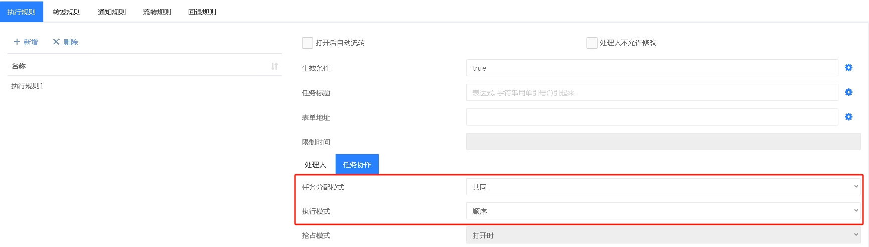 每个环节默认都有一个执行规则,此执行规则默认就是或签的设置;如下“任务分配模式”是共同,“执行模式”是抢占: