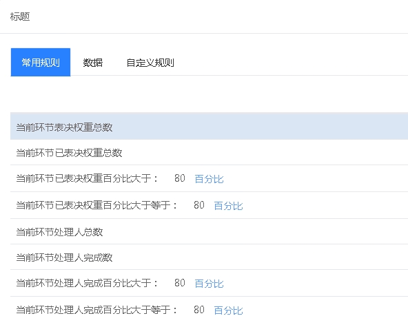强制流转支持表达式设置,默认提供的有如下表达式:当前环节表决权重总数、当前环节已表决权重总数、当前环节已表决权重百分比大于N、当前环节已表决权重百分比大于等于N、当前环节处理人总数、当前环节处理人完成数、当前环节处理人完成百分比大于N、当前环节处理人完成百分比大于等于N