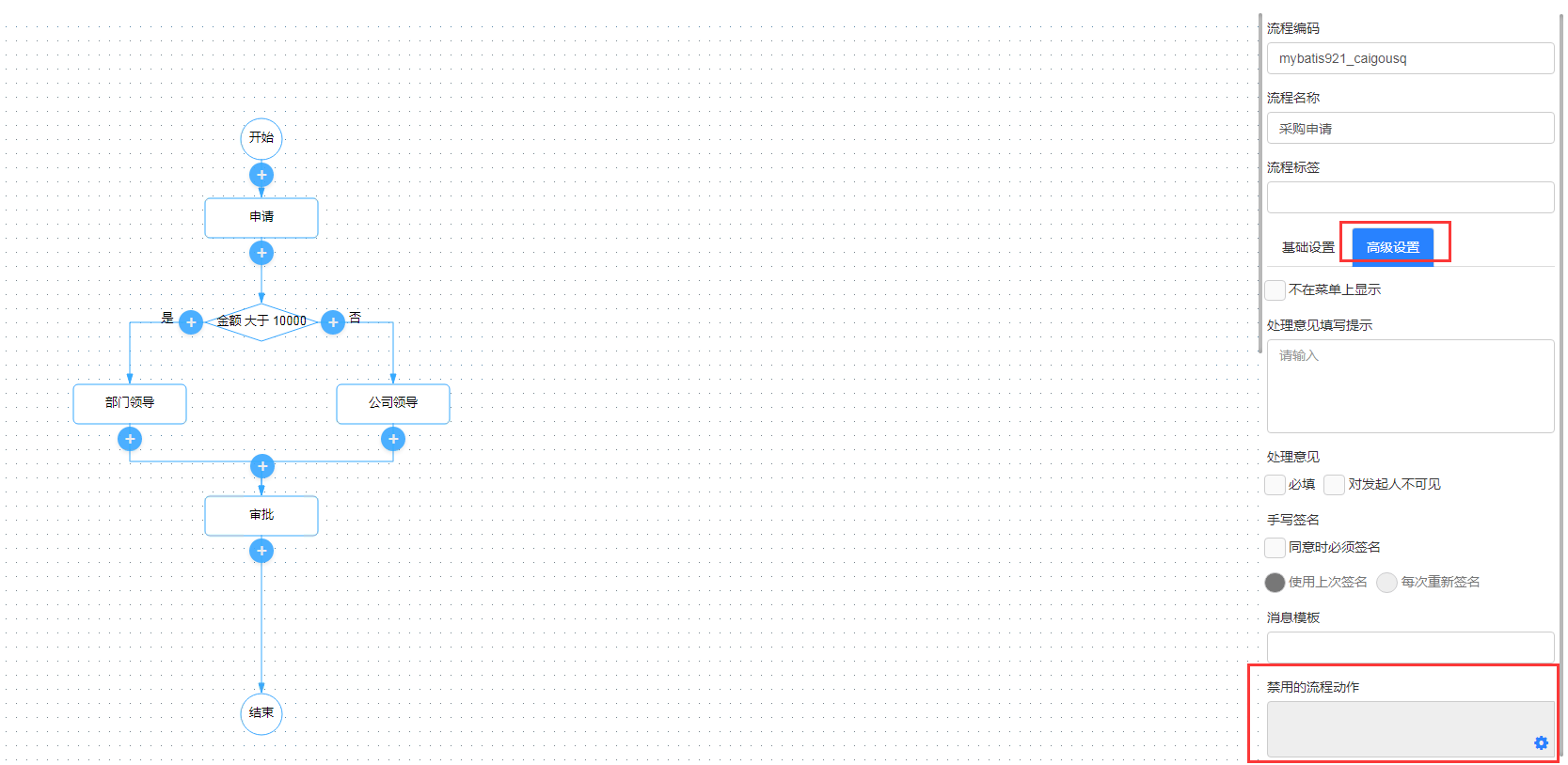 1. 在业务流程绘制区,点击空白处,在右侧高级设置“禁用的流程动作”属性中