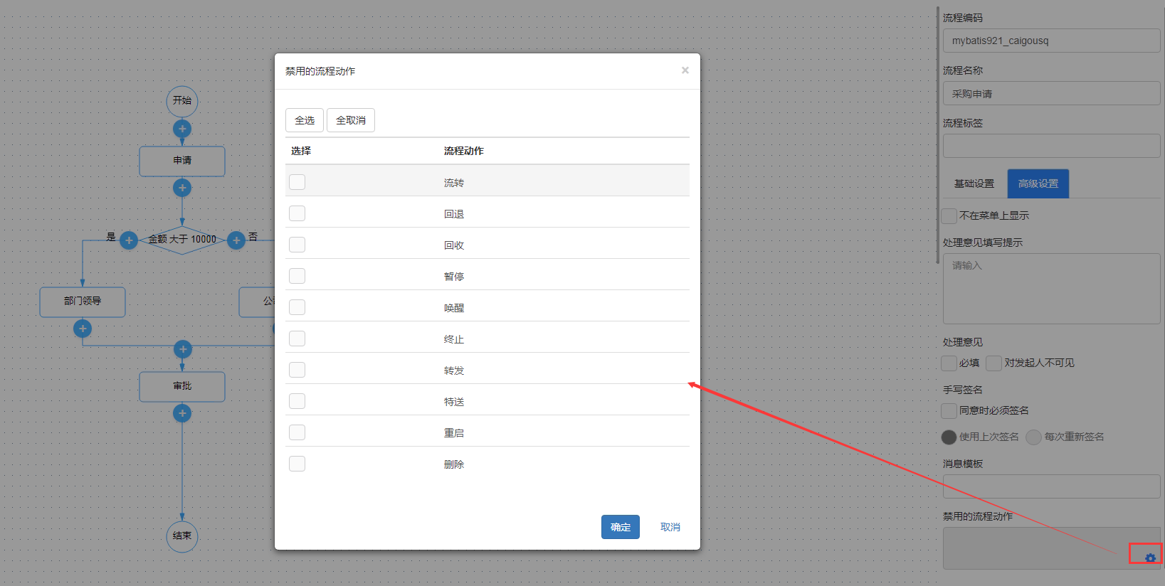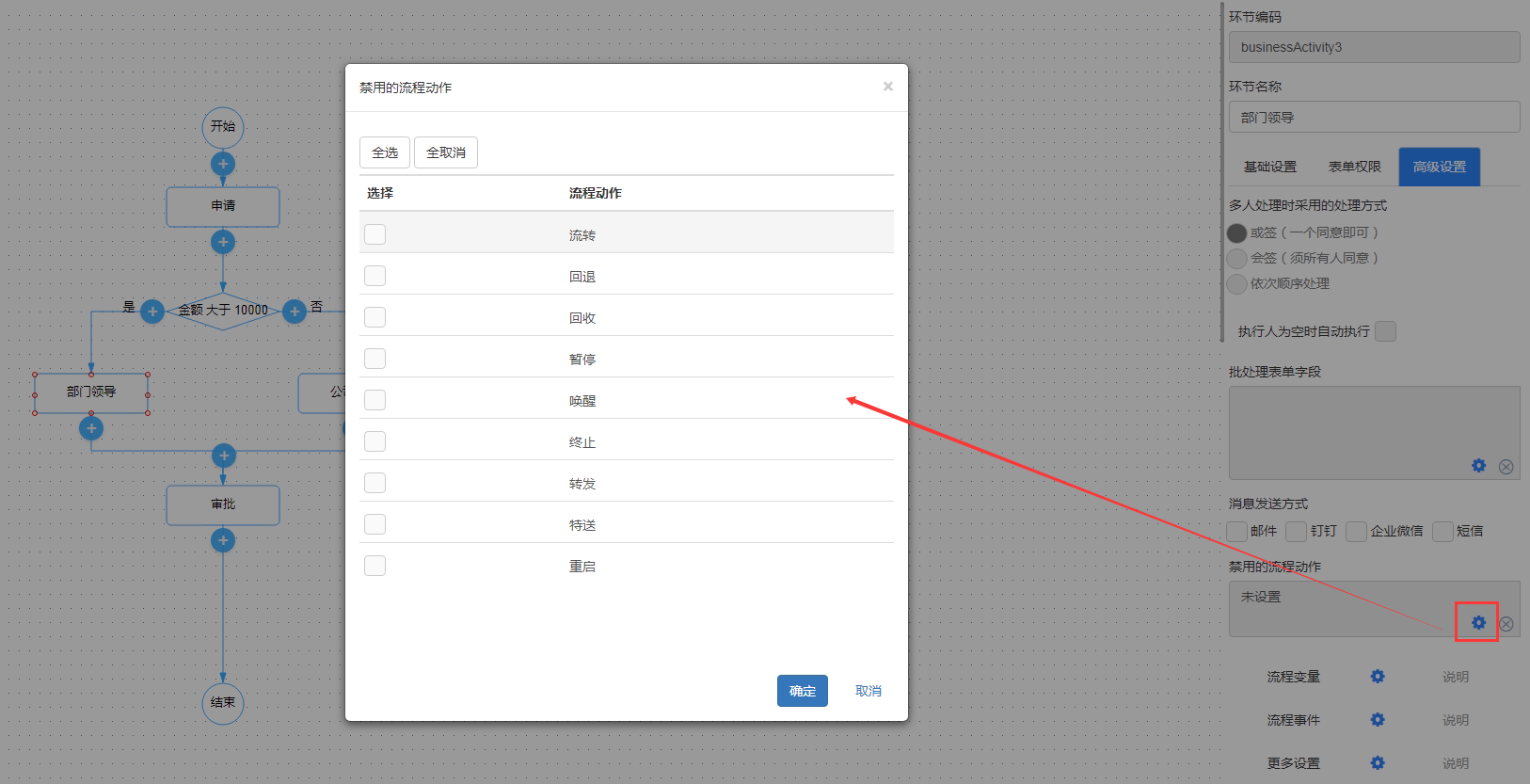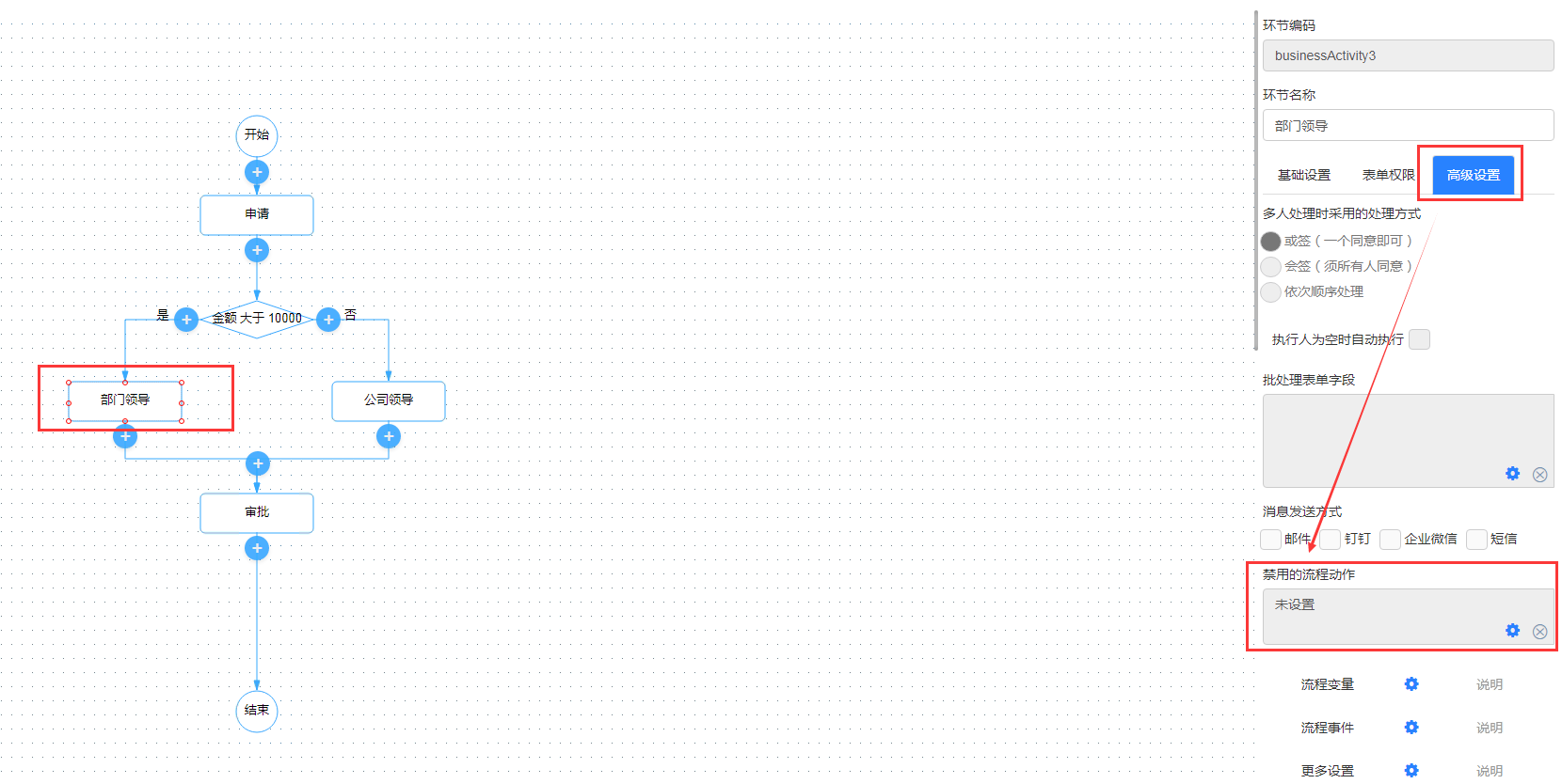1. 选中流程环节,在右侧高级设置“禁用的流程动作”属性中