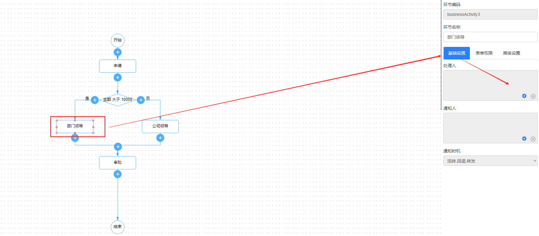 - 选中流程环节,在右侧显示当前环节基础设置页签中设置