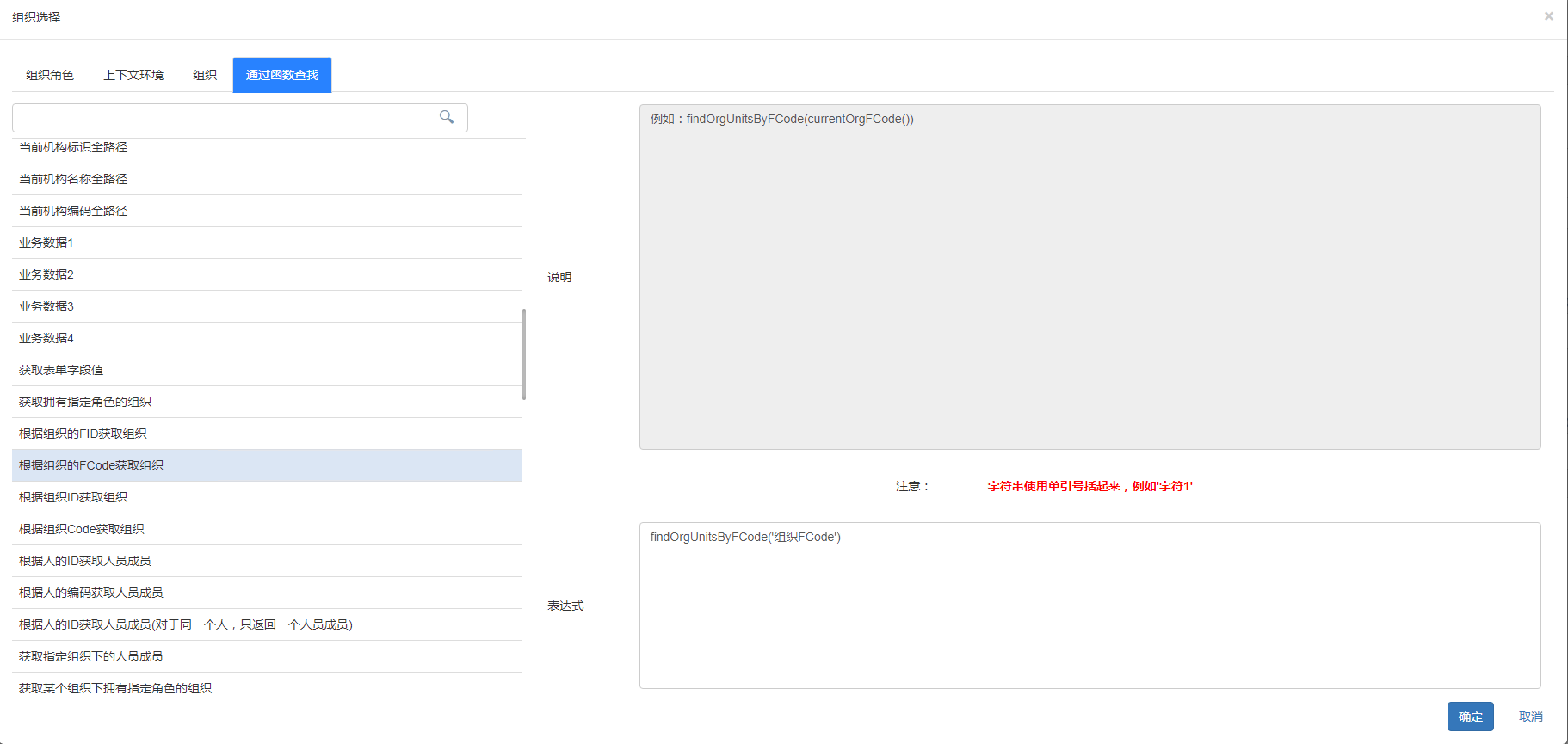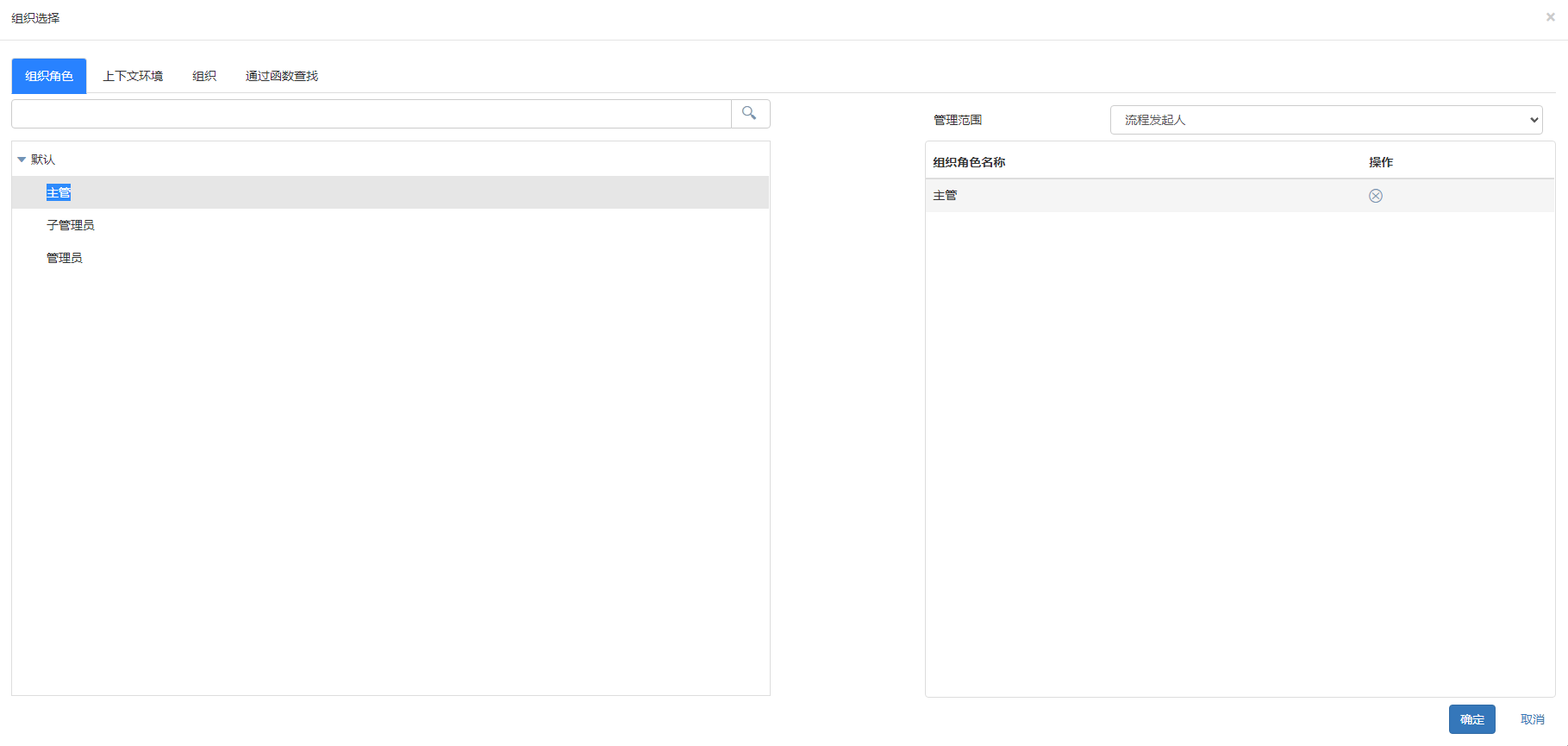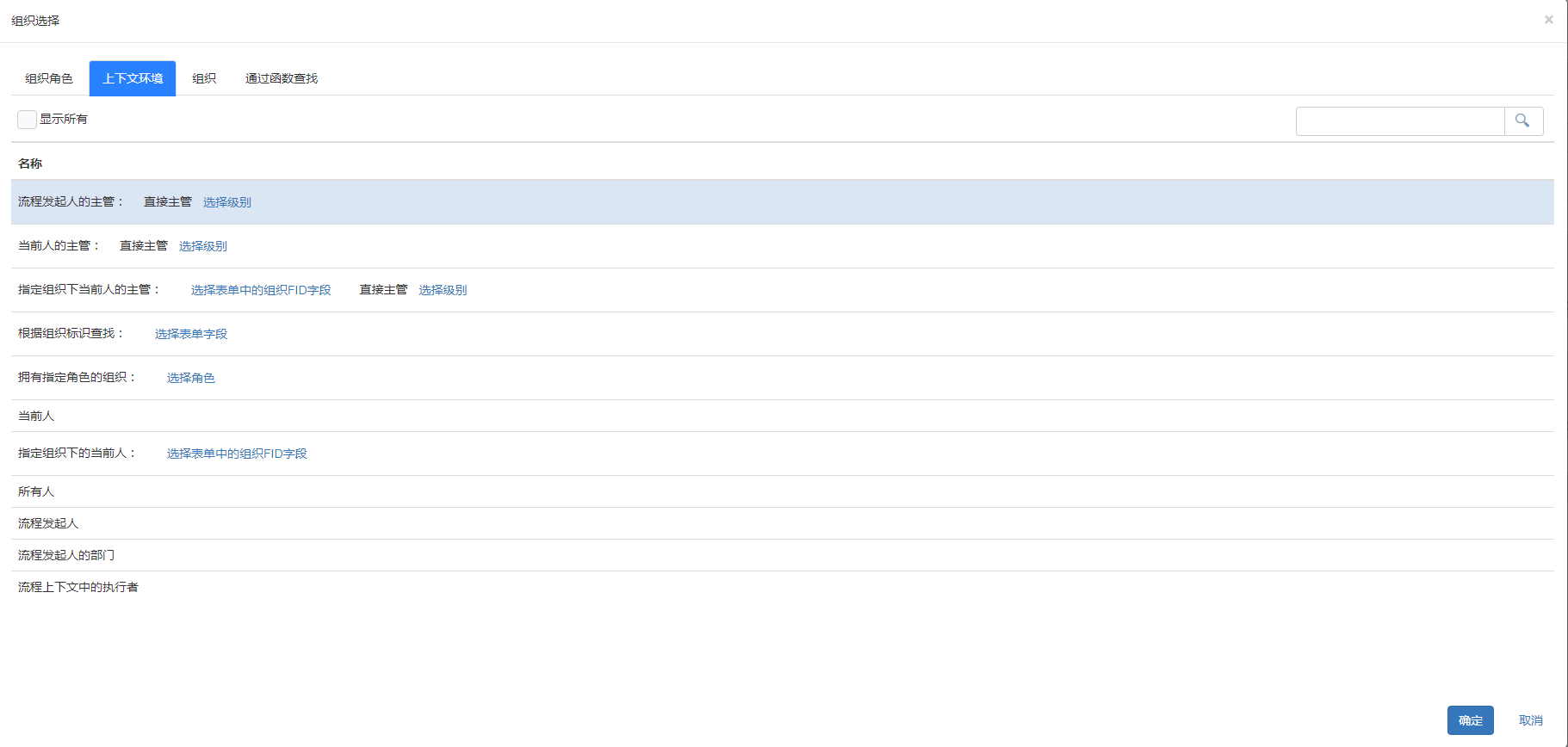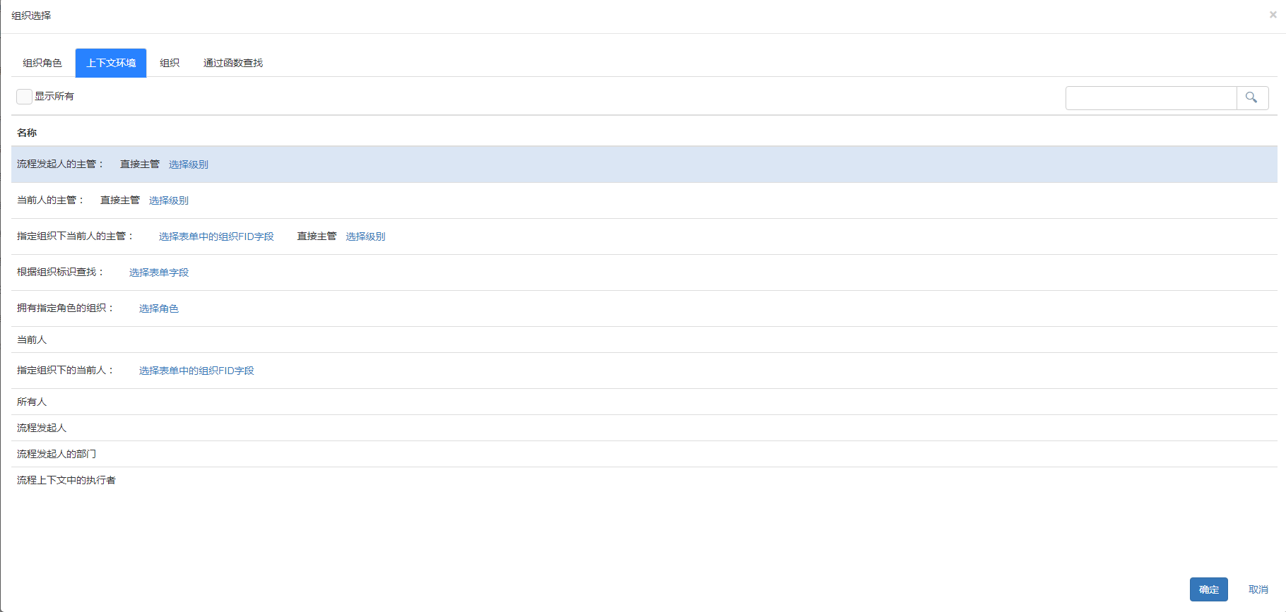 - 上下文环境:根据提供的上下文操作设置,如流程发起人的主管:直接主管,级别为1时,即执行者为:当前流程发起人所在部门的主管人员