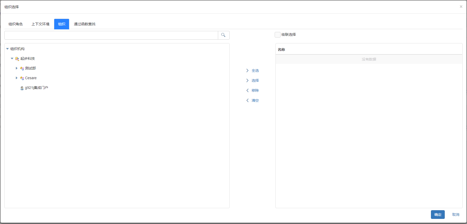 默认不设置执行者时,在任务流转选择执行人时,需要从组织机构节点中查找选择