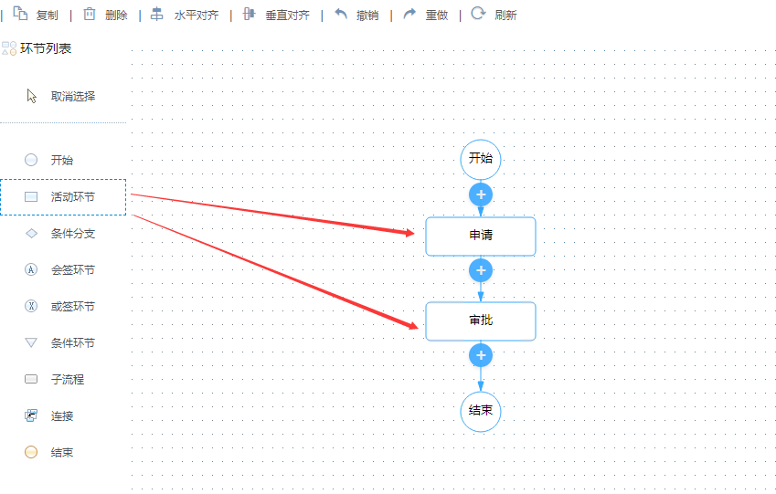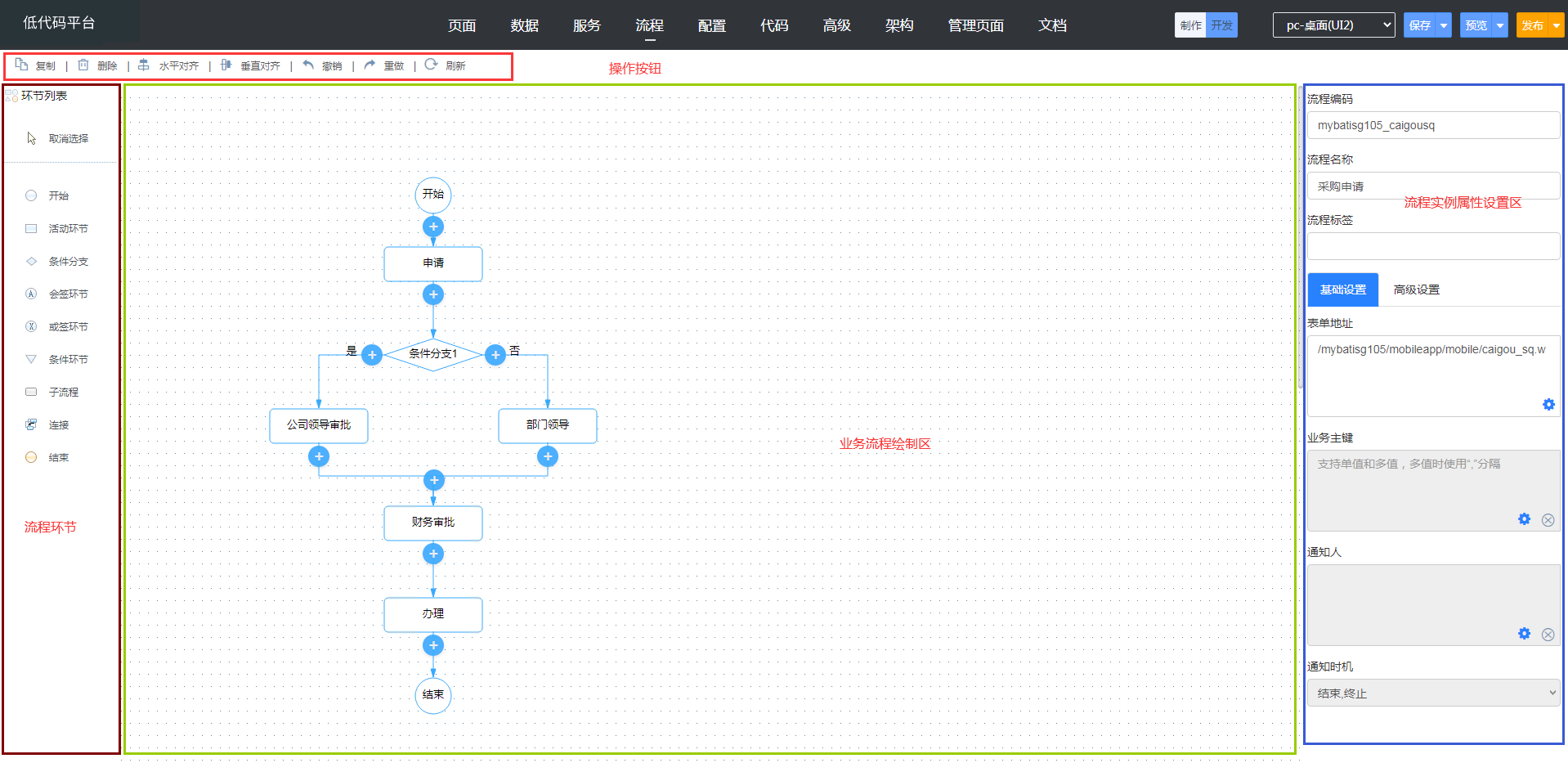 - 业务流程绘制区:根据实际业务流程,在这里进行可视化的业务流程环节设计