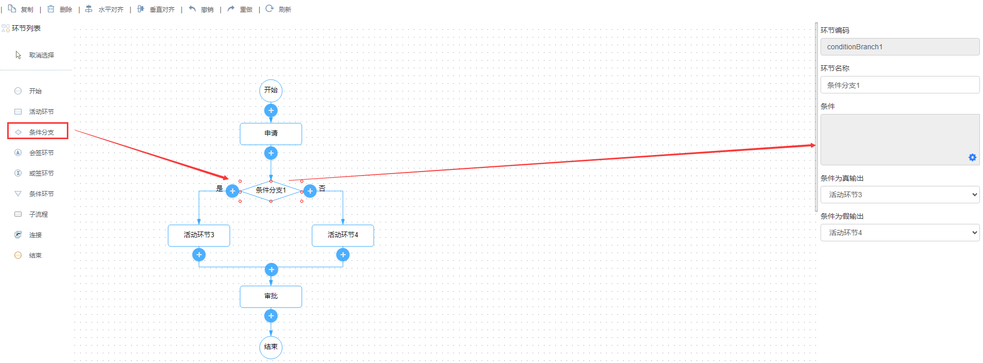 - 条件分支:通过定义条件表达式方式定义满足什么条件才能刺激下一步处理环节操作