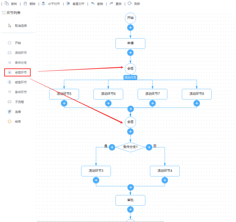 - 会签环节:当流程需要多个并行节点均完成后才可进入下一节点,可在流程上添加会签环节