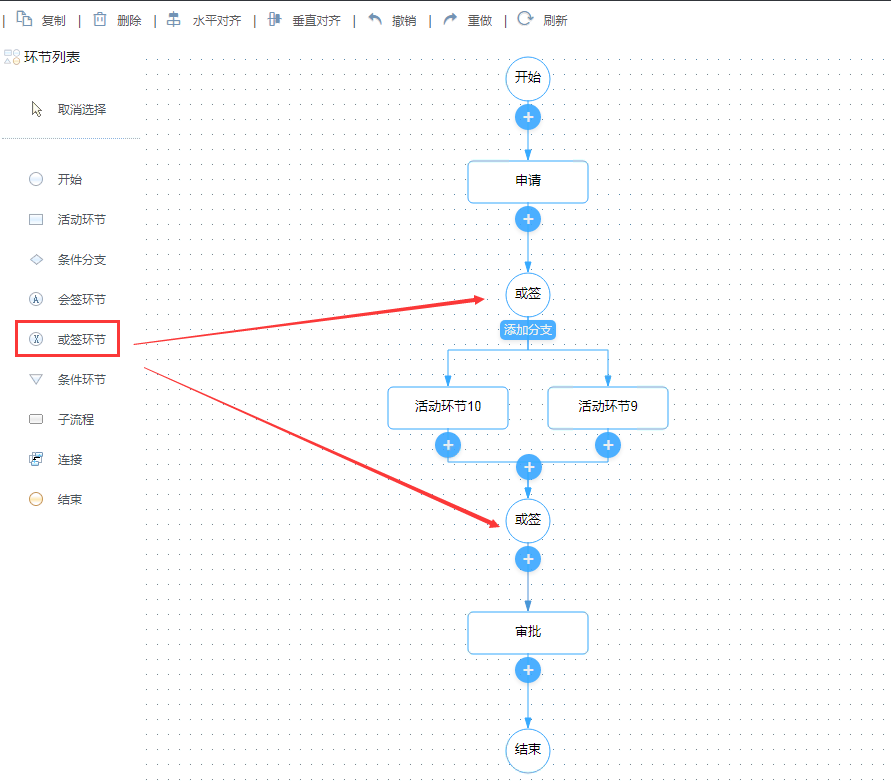 - 或签环节:当流程多个节点执行任意节点完成后进入下一节时,可在流程上添加或签环节