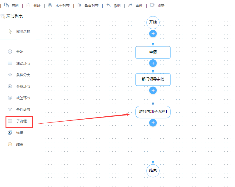 - 子流程:当业务流程进入此环节会时启动一个指定的子流程,如图到财务审批环节进入财务内部审批子流程
