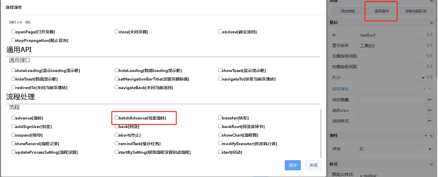 - 如图,在流程页面加工具栏组件,然后选中功能栏组件,在右侧射中点添加操作,选择流程组件的批量流转操作