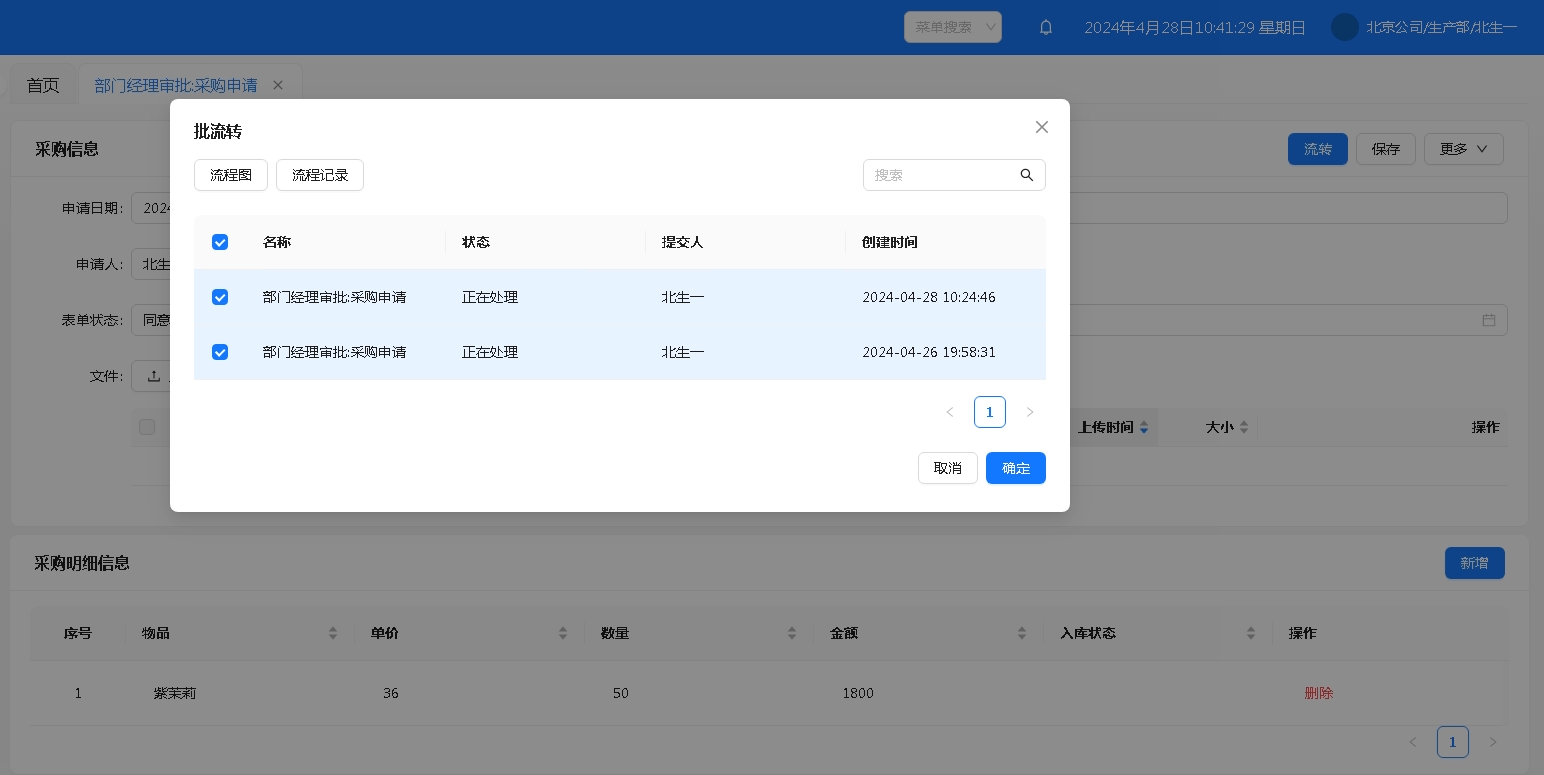 - 表单填写后,点击批量流转按钮,即可打开批量处理任务页面,在此页面中将显示同一属性的审批单,勾选审批单,点击确认流转后,即可实现批量任务处理及业务数据回写操作。