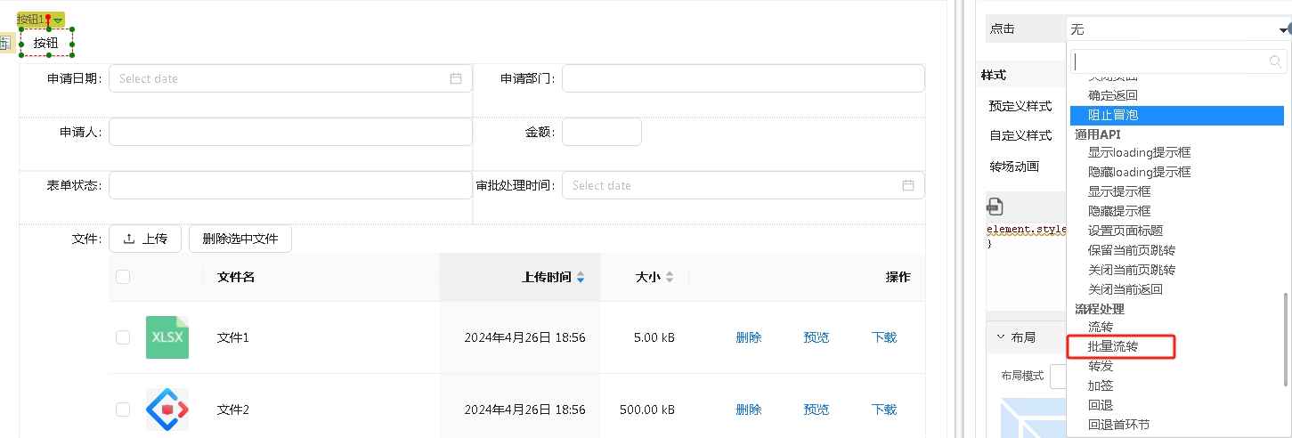 - 或者添加按钮,按钮的点击事件中选择流程组件的批量流转操作