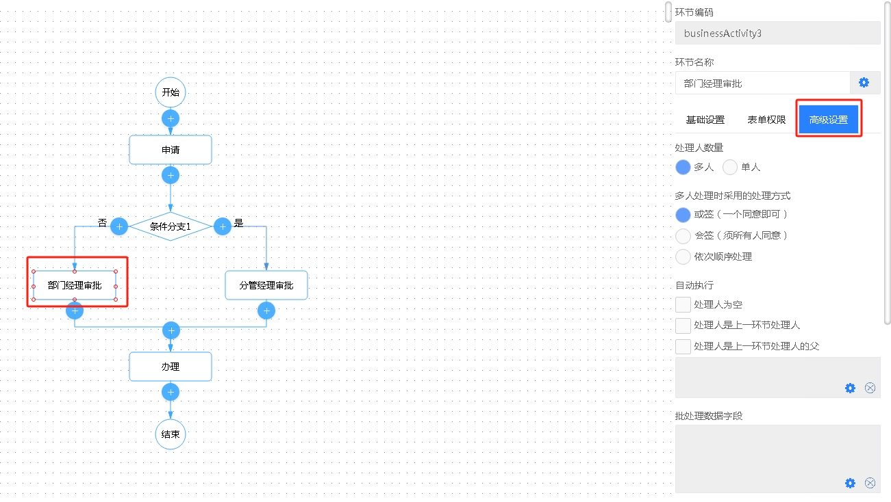 - 在打开的流程页面中,打开流程设计器,选中流程环节,在右侧切换到【高级设置】属性