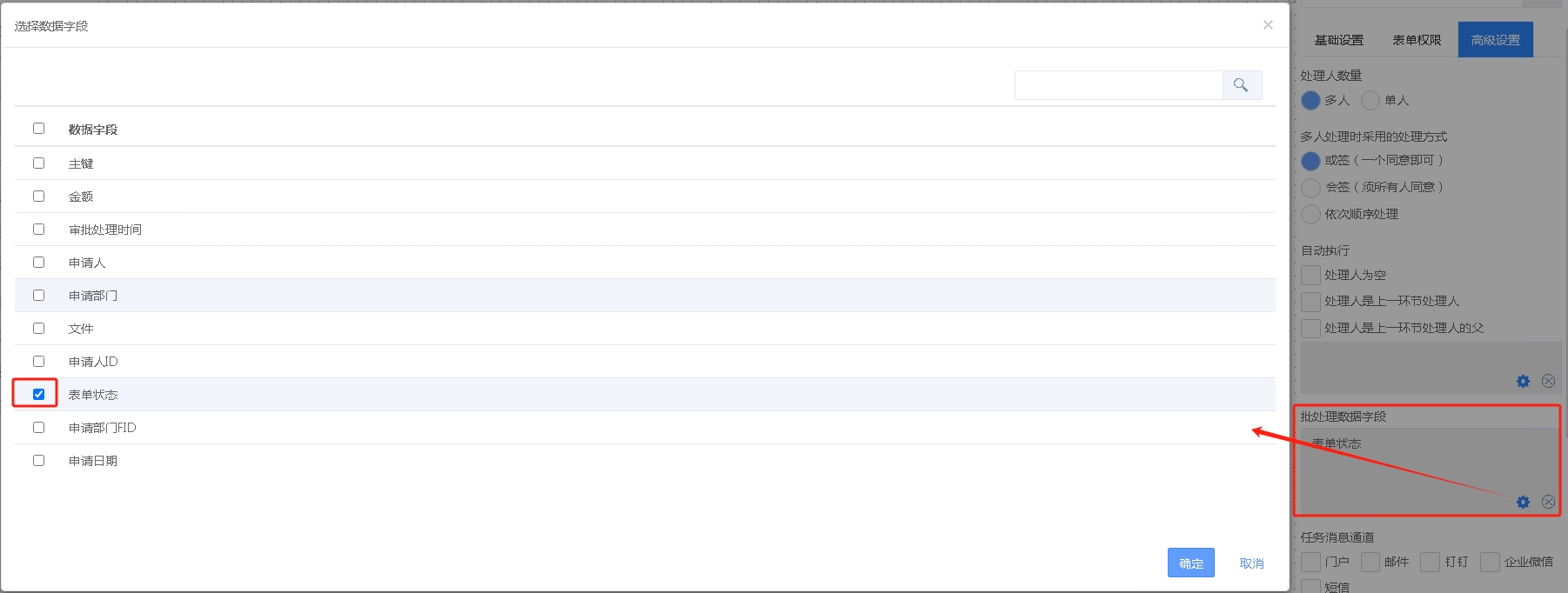 - 在批处理表单字段设置中,打开字段选择编辑器,勾选要批量回写数据表单字段