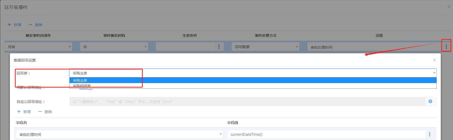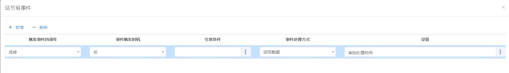 - 同时也可以在流程事件中设置数据回填,打开流程事件编辑器,新建流程事件,如图流程流转后事件中,添加回写数据表单字段设置。对审批处理时间表单字段的回写数据置为:当前日期时间