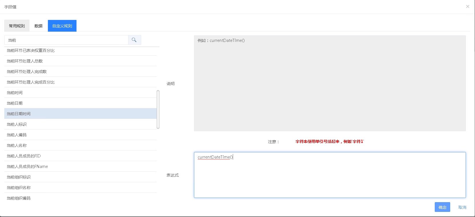 - 点击字段值后三个点按钮,打开字段值表达式编辑器,在此支持自定义设置,也可使用系统提供的函数,如图将审批处理时间表单字段的回写数据设置为:当前日期时间,即流程流转后,将会把当前日期时间回写到表单字段上。