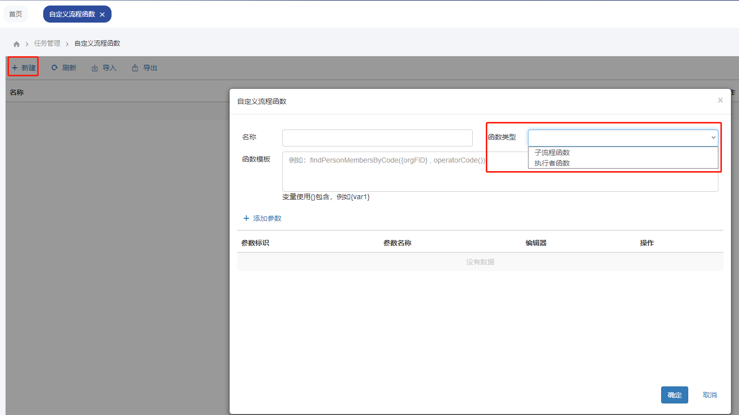 在工作流应用中提供的“自定义流程函数”功能,在此功能中可以创建函数,目前支持了执行者和子流程两类函数的创建。