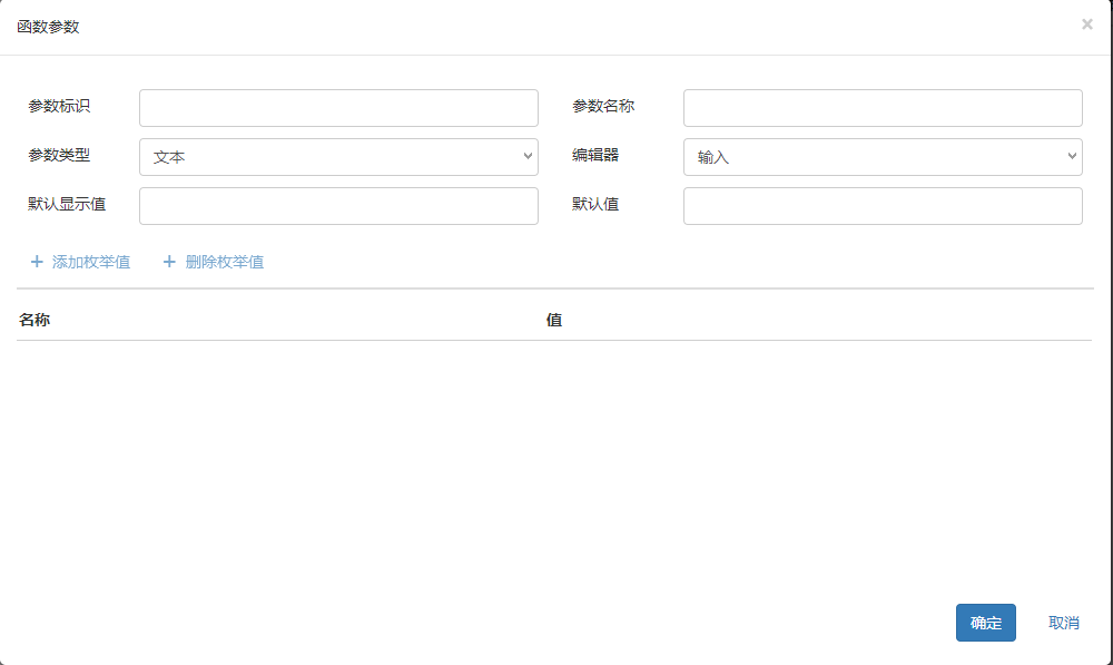 点击“添加参数”弹出的“函数参数”对话框设置参数的类型、默认值、编辑器等