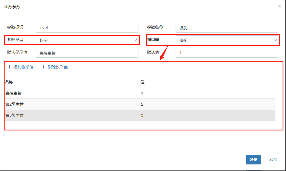 枚举:在流程定义中设置此参数值时可以在函数定义中枚举的值进行选择