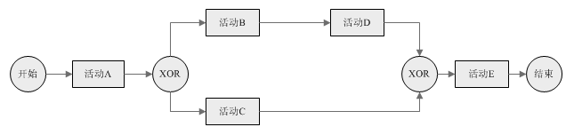 业务流程以PetriNet作为基础理论依据,把业务流程元素和PetriNet元素做了一一对应,并且在此基础之上扩展出更合适于业务模型层的复杂业务流程规则,以形成业务流程定义。同样的,在业务流程运行时的算法体系中也遵循了基本的PetriNet原理,并在此基础之上根据业务流程定义的扩展,也对业务流程运行扩展出相应特性。如图所示就是上个PetriNet图对应的流程图。