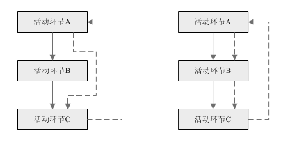 在活动环节上做回退操作了以后,把待办任务发给某个活动环节曾经的执行者。那么此执行者处理完成了以后是把待办任务直接再发给退来的环节呢,还是根据业务流程定义把待办任务再重新一步一步流到退来环节。如图所示,途中虚线表示回退和回退后的流转,左边是按原路返回,右边是重新一步一步流到退来环节。