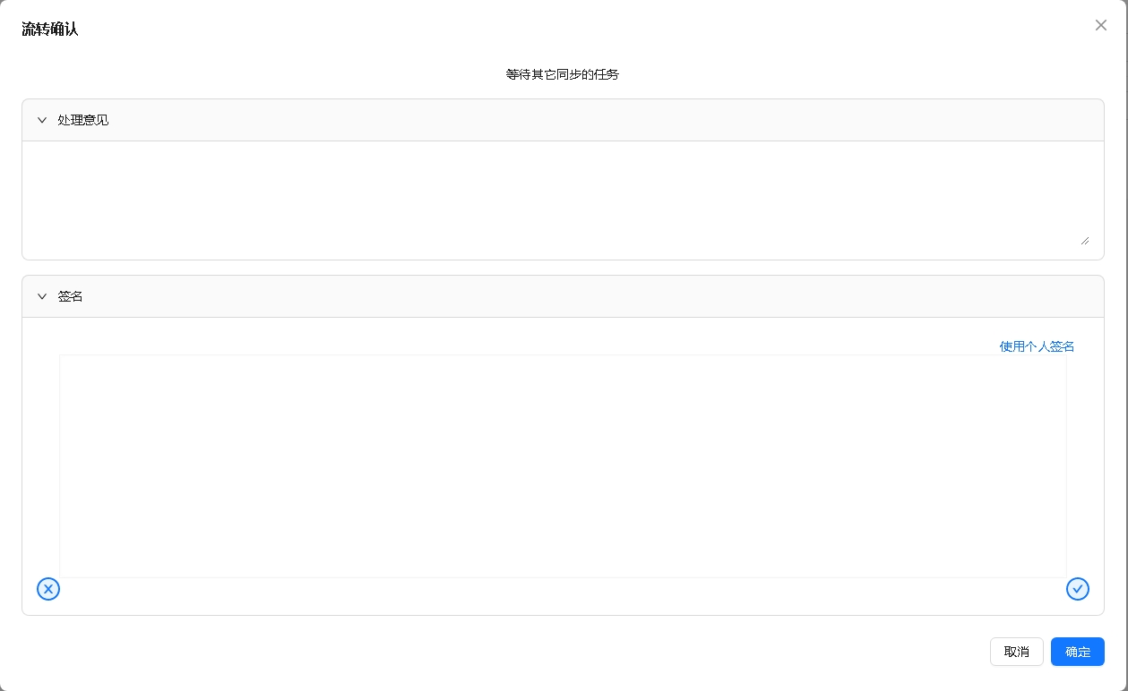 活动环节3、活动环节4和活动环节5通过会签(and)合并(多个环节直接输出到一个环节默认就是会签),三个环节除了最后一个流转的其他前面的环节流转时都是如下图的等待流转对话框,最后一个的流转的时候才会说显示下个环节和处理人等的流转对话框