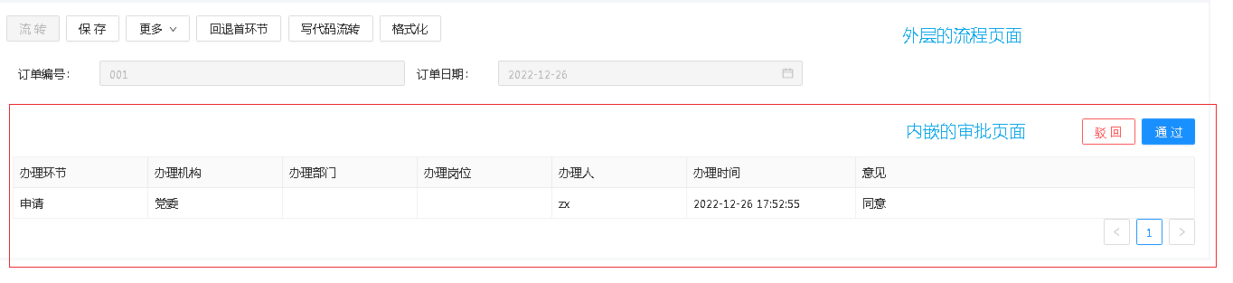 添加一个审批页面,在流程页面中使用内嵌页面组件,嵌入审批页面,在审批页面中调用流程页面中的流程组件的流转、回退等方法
